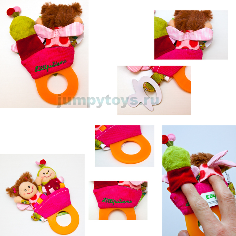 Погремушка/прорезыватель/пальчиковый театр. Пальчиковый театр?? Да-да, вы не ослышались! 3 в 1. Удобно и очень креативно. Главные герои - божья коровка и Лизи. Они же - пальчиковые куколки, с помощью которых родители могут устроить представление в любом месте, где оно потребуется =) Предусмотрена специальная петелька для соски.