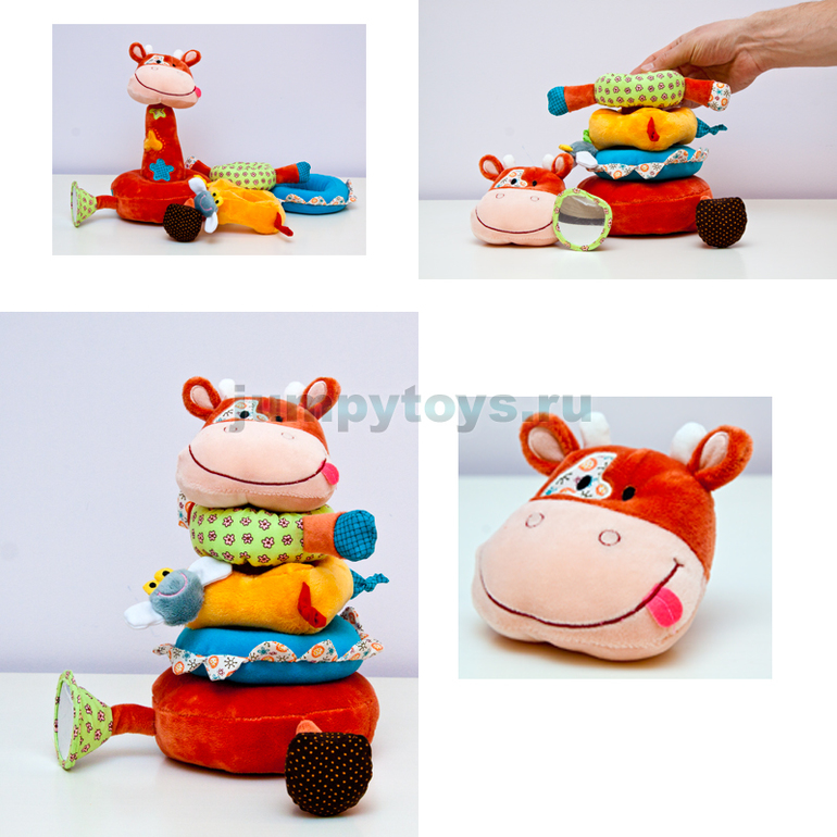 Пирамидка в образе коровки Вики состоит из трех колечек разных цветов, выполненных из разных на ощупь материалов. К тому же здесь припрятаны и другие любимые малышковые детали: зеркальце, шуршалки, пищалки, бубенчик. Внутри головы коровки - магнит, так что надеть ее на основание и собрать всю фигуру целиком (после нескольких проб) труда не составит.