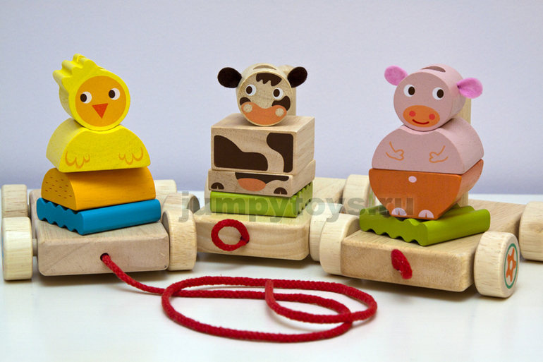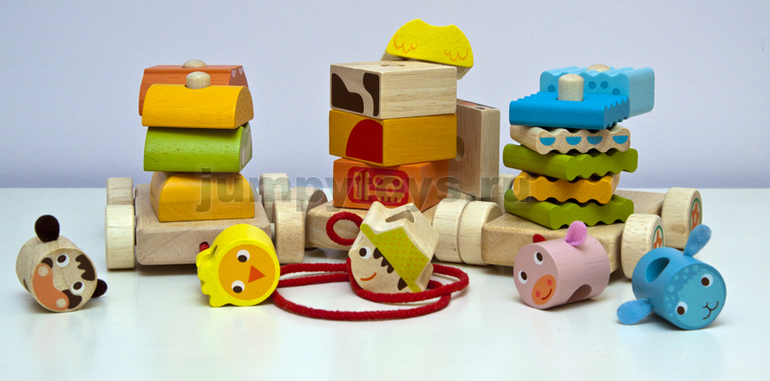 Во-первых, паровозик, состоящий из нескольких вагончиков (скрепить их между собой малышу еще предстоит научиться). Паровозик на колесиках, все как полагается =) Да еще и с веревочкой, можно катать за собой.