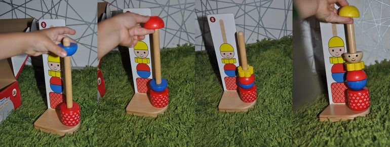 Задача проста - собрать человечка по аналогии с картинкой. При этом сама картинка помещается в специальную прорезь на основании, как-бы фоном к штырьку, на котором и собирается человечек, что облегчает задачу и придает игре наглядность.