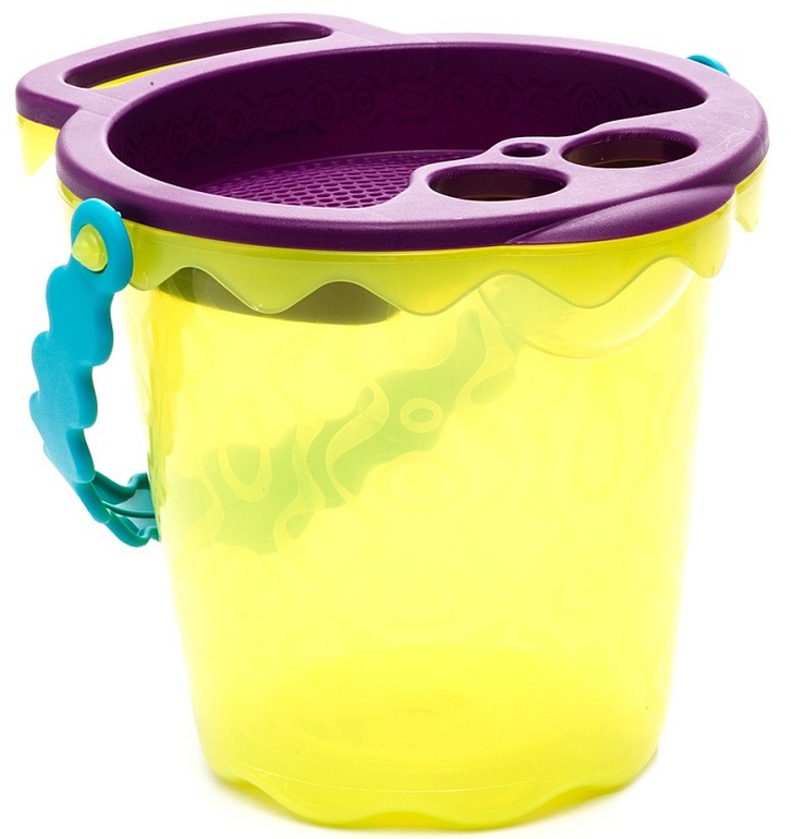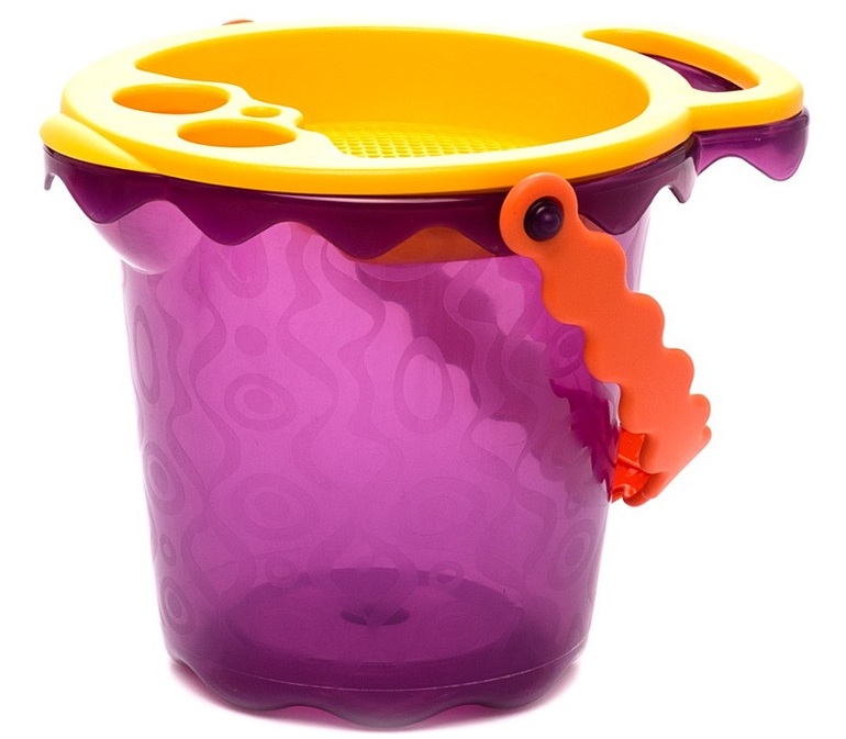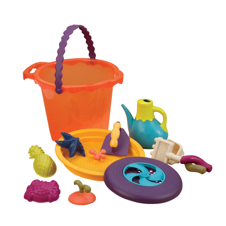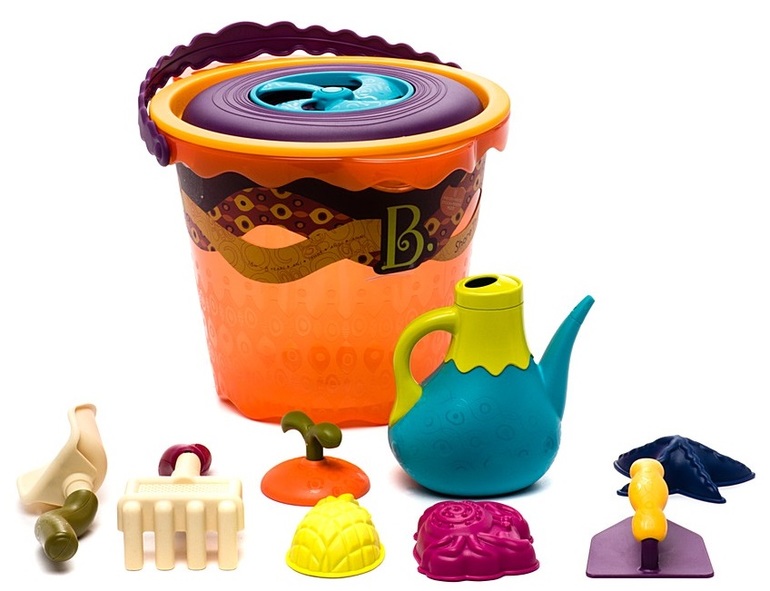 В наборе: большой ведёрко с забавной ручкой, летающая тарелка-фрисби, сито, грабли, лопатка, мастерок, лейка, 2 формочки для строительства замков, форма для создания сфер.