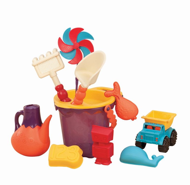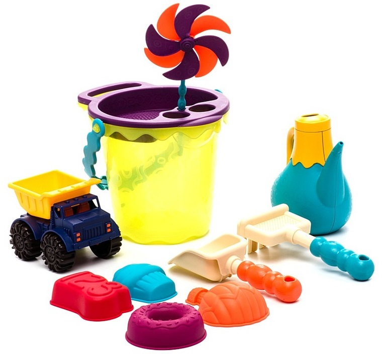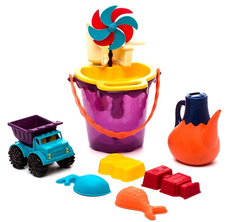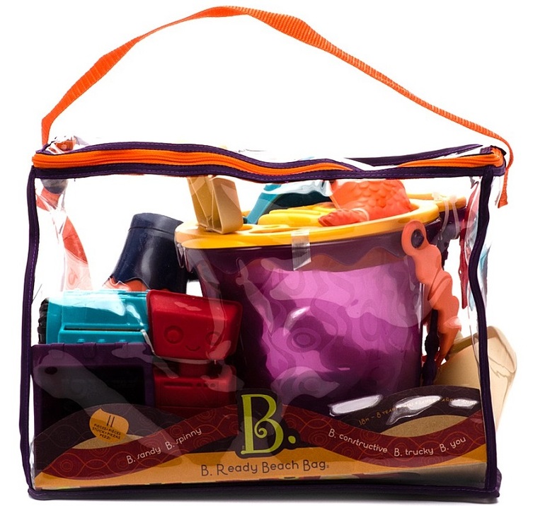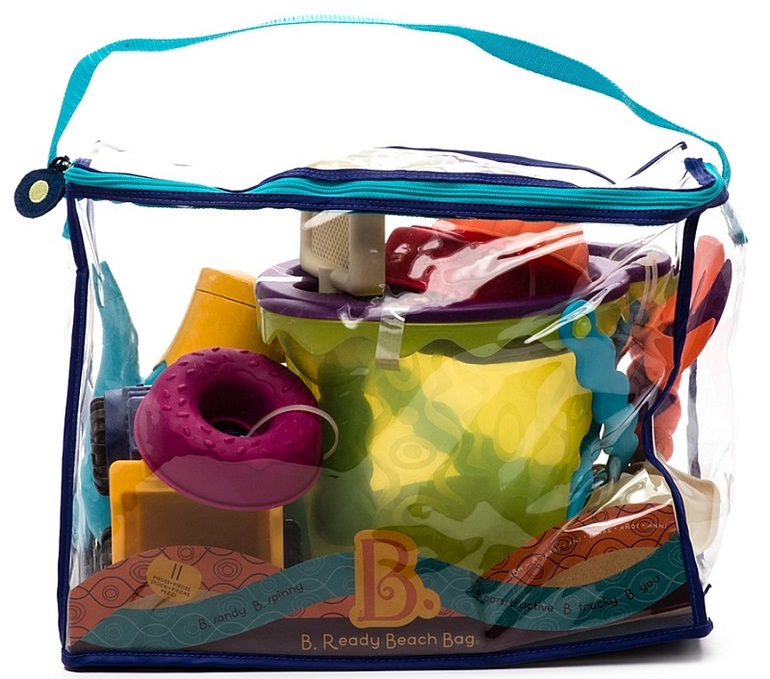 В наборе: ведёрко с забавной ручкой, грабли, лопатка, 4 формы для песка, сито, грузовик-самосвал, лейка, воздушная вертушка, прозрачная пляжная сумка для хранения и комфортных путешествий.
