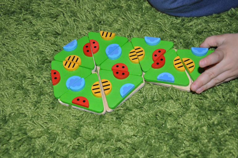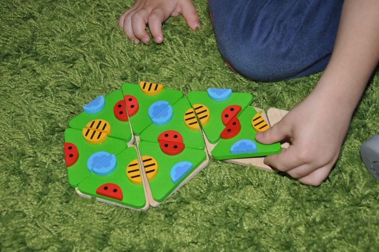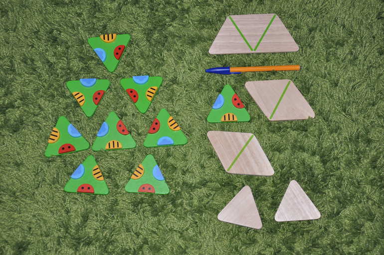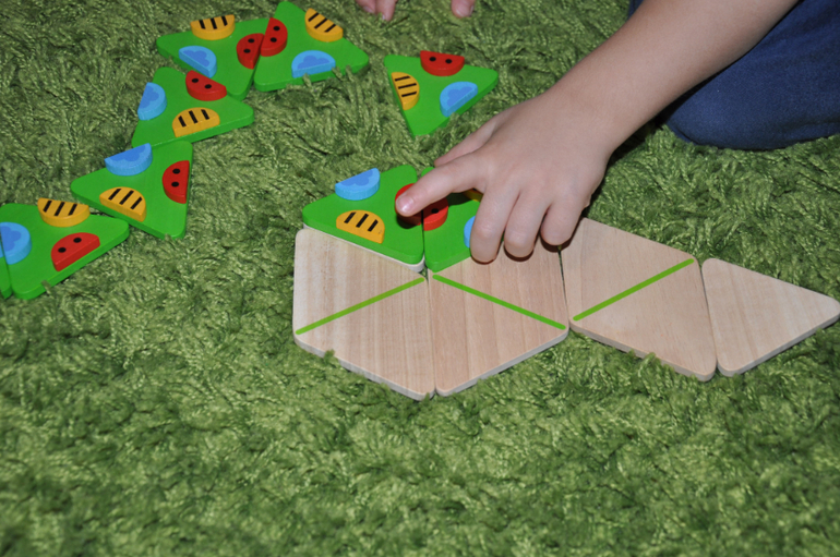 Правила сводятся к тому, что сначала надо выложить фигуру из треугольников-оснований, а затем постараться таким образом наложить на них треугольники с жучками, чтобы рисунок сошелся.
