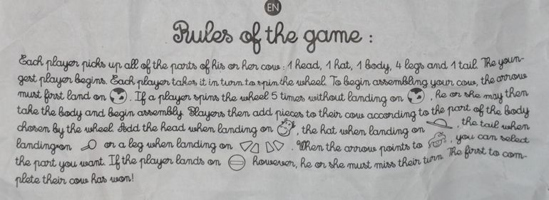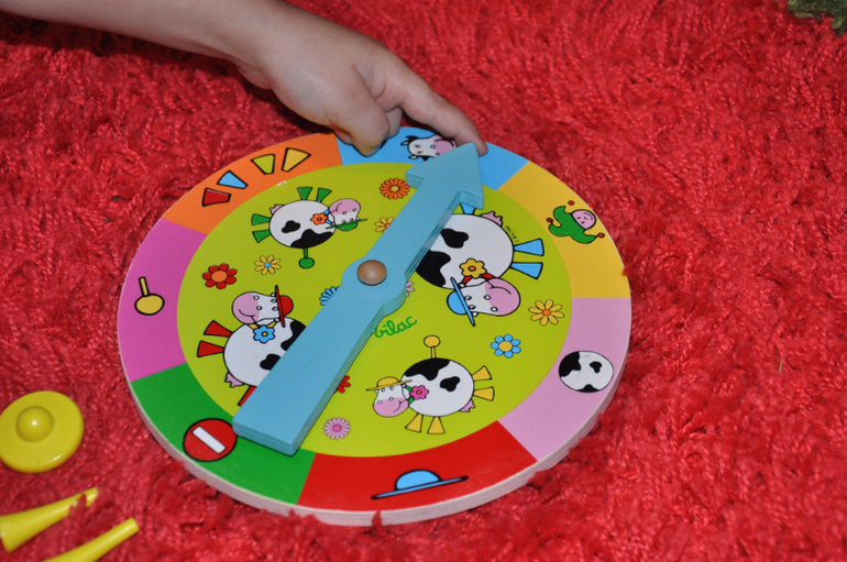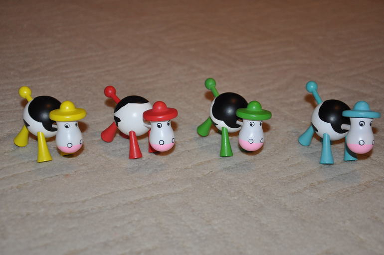 Цель, соответственно, первым собрать корову)) Для начала надо, чтобы стрелка указала на шарик-туловище, но, если в течение 5 раз на туловище стрелка не выпадает, то можно просто взять его и начать собирать корову. "Кирпич" означает пропуск хода, а "Шут" дает право выбрать часть))