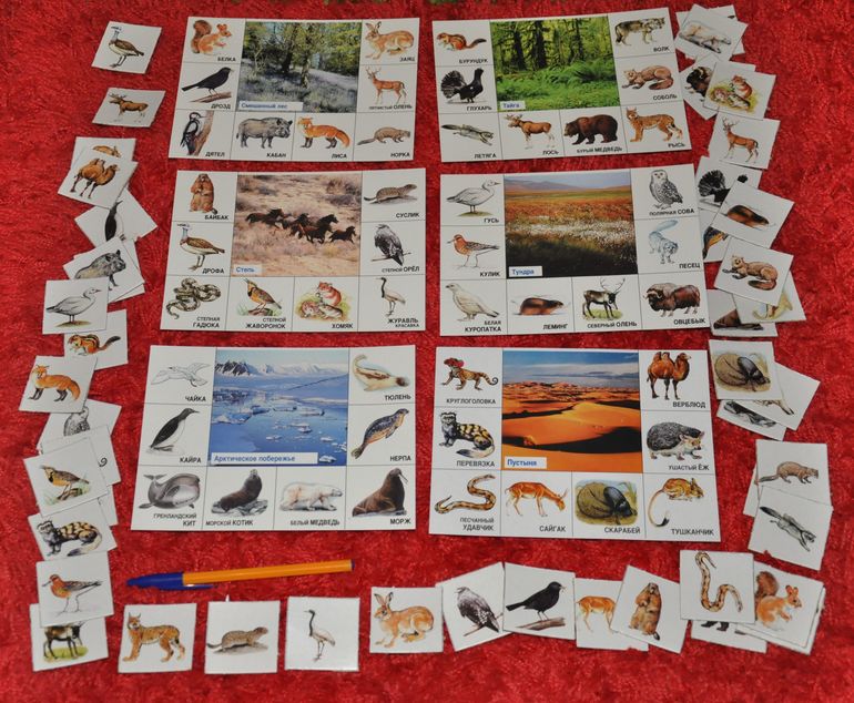 Еще одно полезное лото для изучения представителей животного мира и среды их обитания. Все детали тоже из тонкого картона.