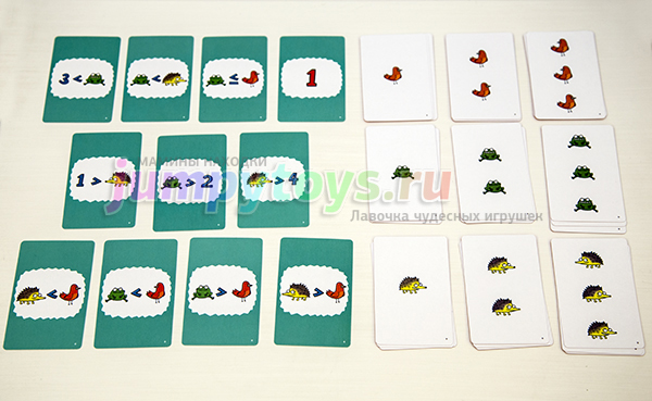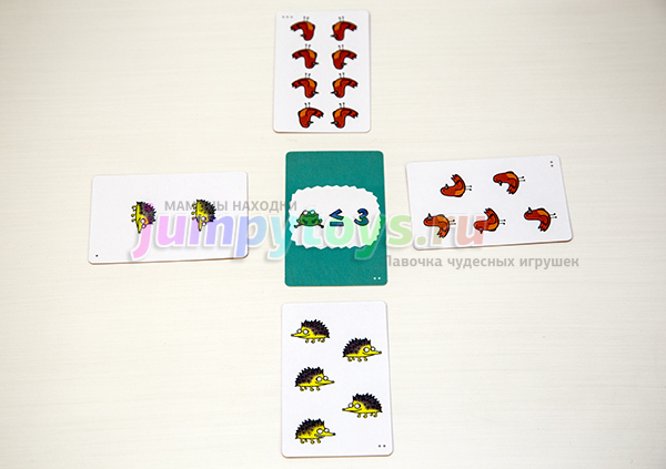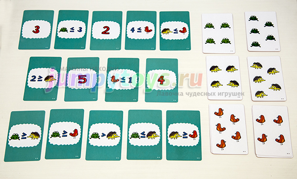 Далее первым ходит тот, кто только что забрал все карты. Смотрим на задание. На сей раз это другая разновидность. Будем сравнивать животных между собой. Ёжиков должно быть больше, чем птичек.