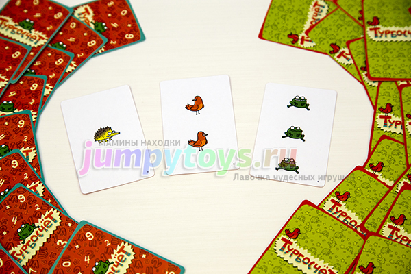 Напомним еще раз: "как только на столе оказываются нужные карты, следует быстрее всех накрыть карту с условием и крикнуть «Турбо!». Счастливчик забирает себе все открытые карты соперников и кладет их под свою колоду. В финале выиграет тот, у кого стопочка окажется посолиднее".