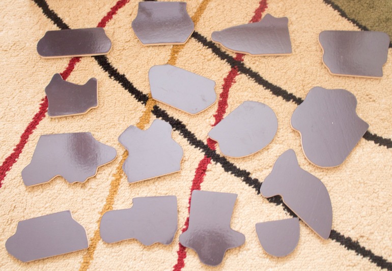 Обратная сторона полностью покрыта магнитной пленкой. Детальки из очень плотного ламинированного картона, зубки не помеха))) вот примерная толщина деталек.