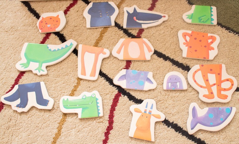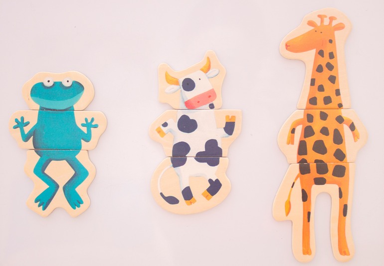 В наборе 8 животных ( морж, олень, крокодил, тигр, собака, корова, лягушка, жираф), каждое животное поделено на три ровные части, очень удобно))) Можно выучить с их помощью части тела и цвета и как какое животное выглядит) .Игрушка замечательная,я бы рекомендовала ее от месяцев 9-10 и до....(пока не надоест).