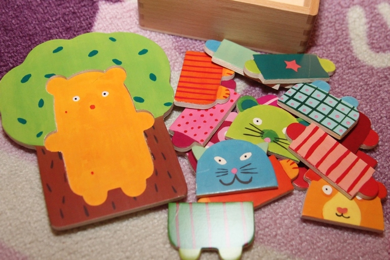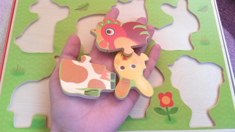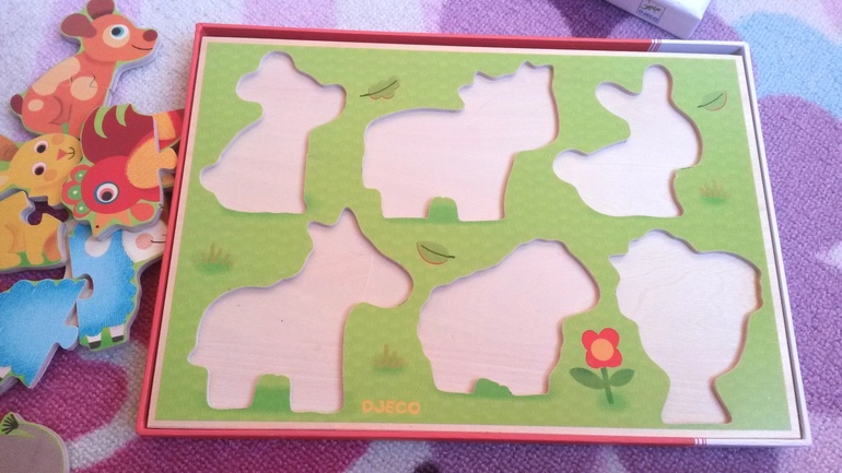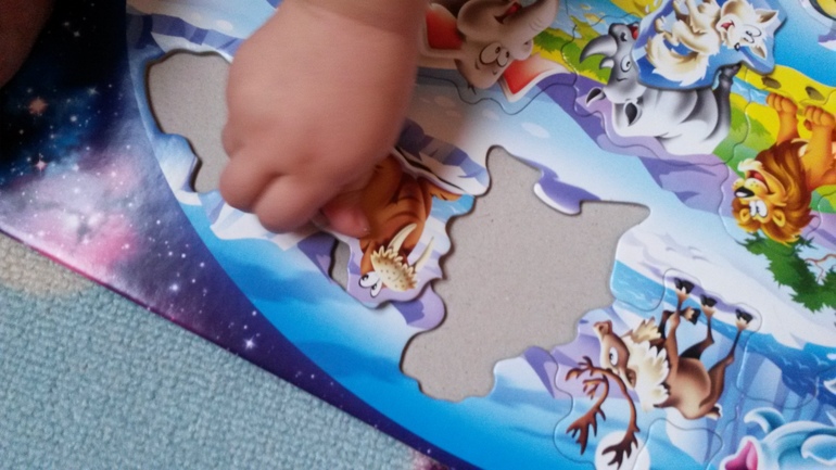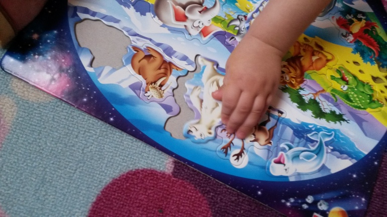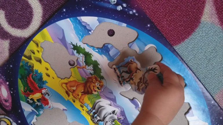 Местоположение каждого зверя дочь выучила очень быстро, на третий раз, по-моему, уже всех на свое место определяла. Вставить не всех получалось с первого раза, если не получилось, особо не упорстввовала, оставляла деталь лежать сверху, переходила к следующей))