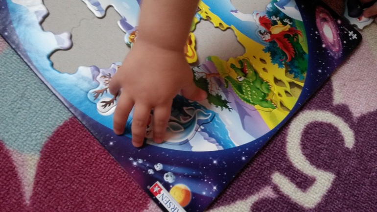 Мне нравится, что она аккуратно складывает детальки рядом с пазлом (в начале нашего знакомства с пазлами в декабре детали при разборке пазла заклыдвались и за спину, и просто раскидывались вокруг - вот так рука взяла, так и кинули)), рассматривает каждую.