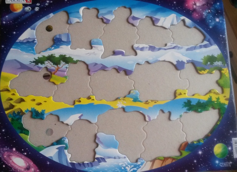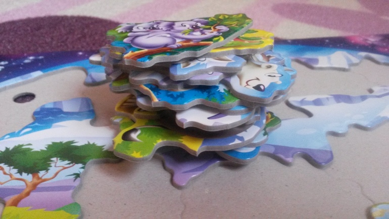 Принцип сборки деталек не классический, нет пазлового замочка, детали произвольной формы, на подложке вырубка, повторяющая форму деталек - судя по всему, ей дети оч пользуются как подсказкой))