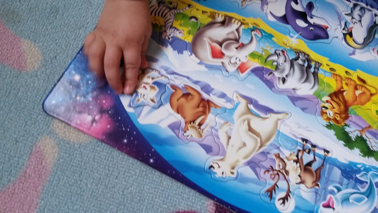 Мне нравится, что по краям у пазла есть такая рамочка, есть подложка (не просто на полу собираем) - в процессе сборки не разъезжаются, поэтому собирать пазлы из большого колич.деталек малышам попроще ))