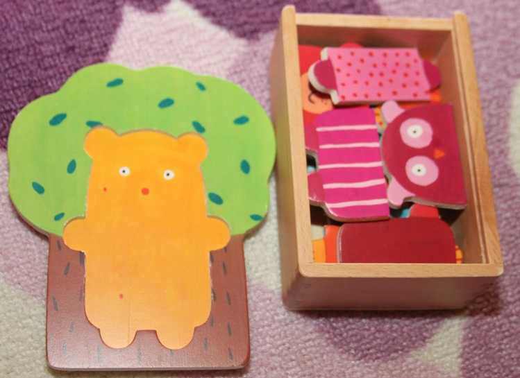 Пазлы в коробочке миниатюрной, деревянные, детальки тоже удобные, собирается по цветам звери.