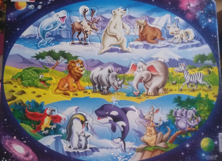 Наш пазл очень похож на пазл-вкладыш: в нем 15 деталек, расположены они в 3 ряда, по 5 животных в каждом ряду.