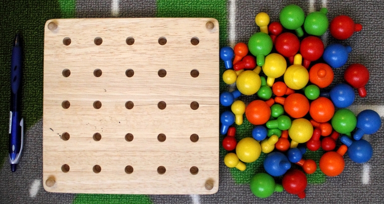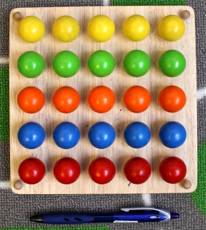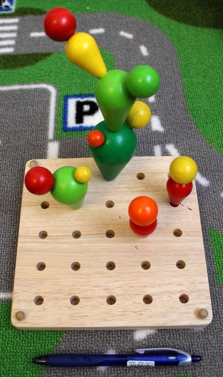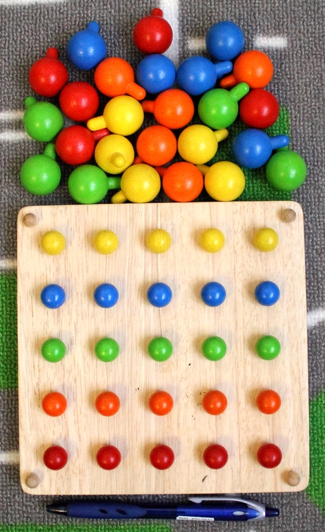 Сказать что это потрясающая игрушка, ничего не сказать. В ней столько всего, очень хорошо помогает освоить захват тремя пальчиками, с ее помощью можно выучить основные цвета, счет до 5, научиться основам сортировки. Мозаика из дерева, очень хорошо обработана и тщательно прокрашена.