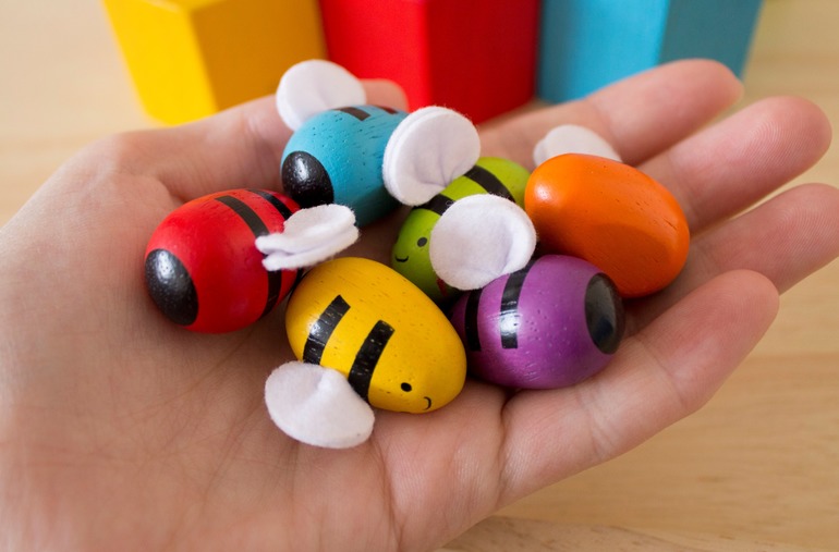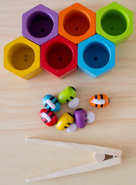 Пока малыш маленький, он может раскладывает этих миленьких пчелок по сотам пальчиками. Станет постарше, будет использовать пинцет основной стороной, а еще старше обратной стороной, что еще сложнее.