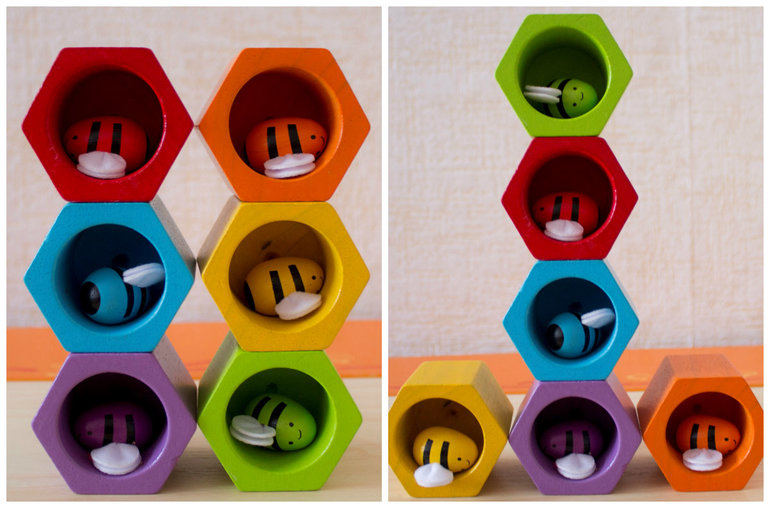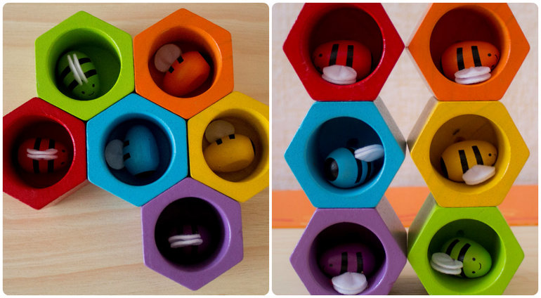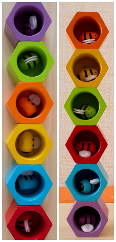 А вот эта наша самая любимая игрушка. Пчелок мы нежно любим. И кормим их, и целуем, и дажемедовухусуп из них готовимОни очень маленькие но хоть сама игрушка рекомендована малышам от 3+, я бы 100% рекомендовала ее от года, ну от 1,5 лет уж точно. Так же можно сортировать их по цветам. И чем старше малыш тем инетреснее ему будет в нее играть, так как игрушки хватит надолго, с каждым разом можно усложнять задачу.