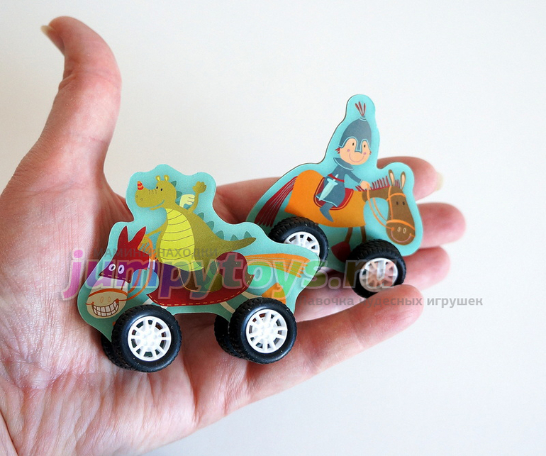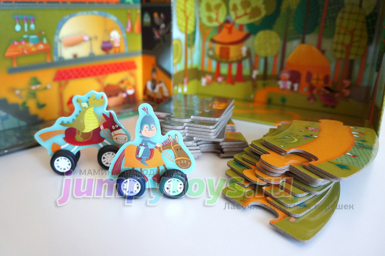 24 детали пазла-дороги (двухсторонние!), две фигурки всадников (для удобства - на колесиках =), а еще... Не правда ли, замечательная идея? Упаковка стала частью игры!