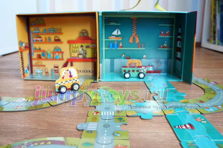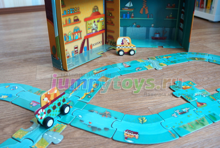 Прелесть набора в том, что дорогу можно выстраивать как угодно! Хоть это и пазл, единственно правильной схемы сборки у нее нет. А тут к творческим задачам подключаются еще и логические: как составить детали таким образом, чтобы получались дороги, перекрестки, развязки?
