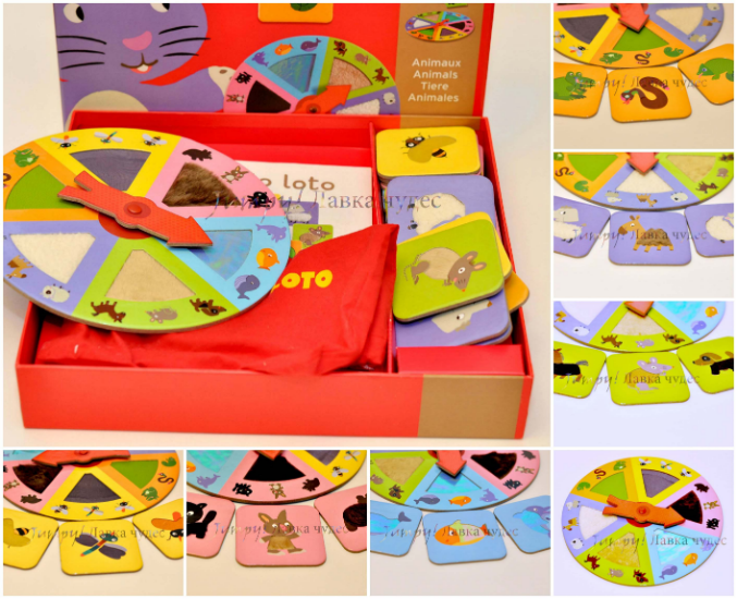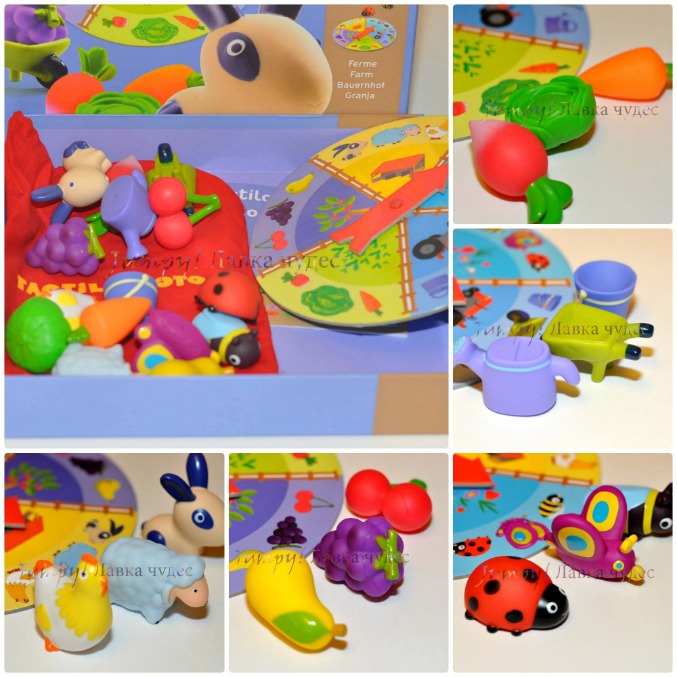 В набор входит игровое поле со стрелкой и 15 разноцветных фигурок (курочка, овечка, фрукты-овощи, лейка, тачка и пр.). Теперь можно научиться различать предметы не только видя их, но и изучить каждый на ощупь.