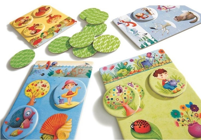 Развивающая игра включает 4 игровых поля с изображением времен года и 16 круглых фишек с картинками деревьев, снеговиков, божьих коровок и т. д. Совместив фишки с такими же изображениями на картонном поле, малыши могут рассказать о том, что характерно для того или иного времени года.