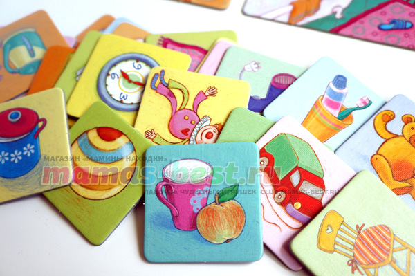 Карточки и поля выполнены из твердого высококачественного картона. Если малыши не справятся сами с поиском незнакомых предметов, им могут помочь родители!