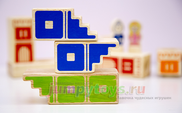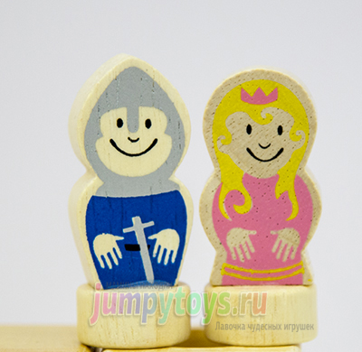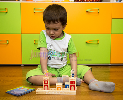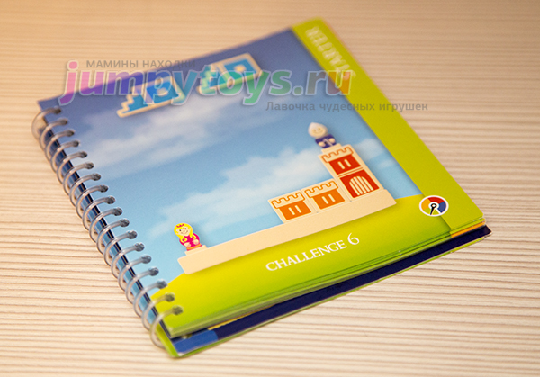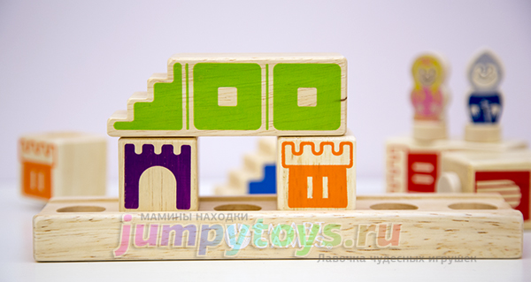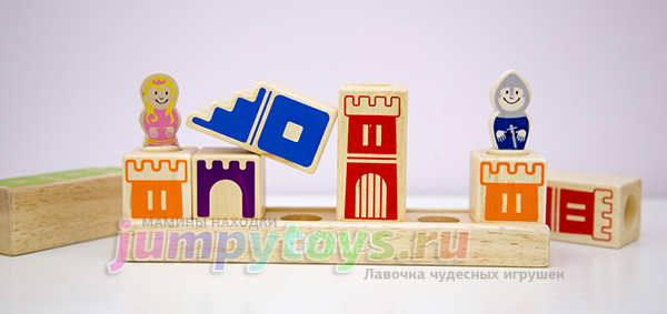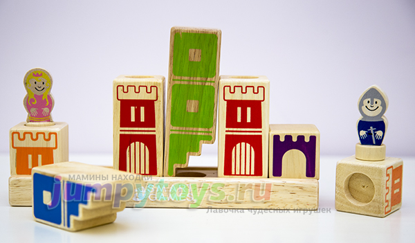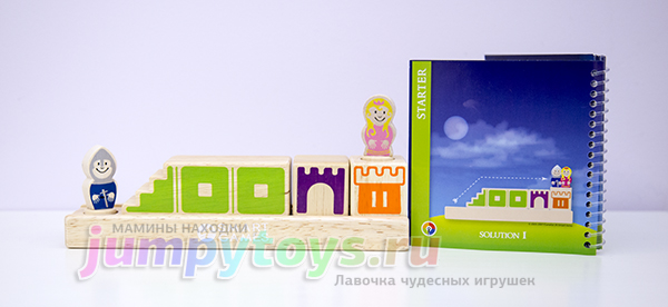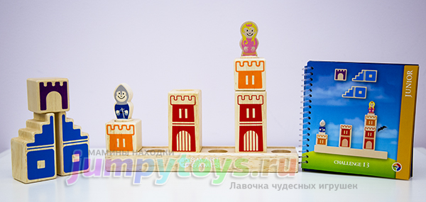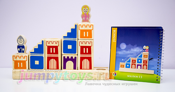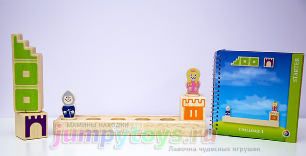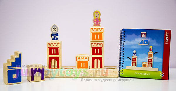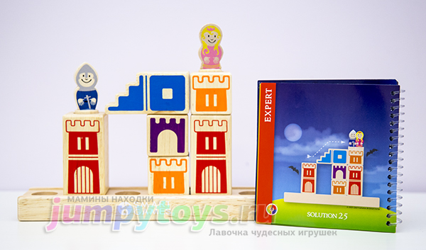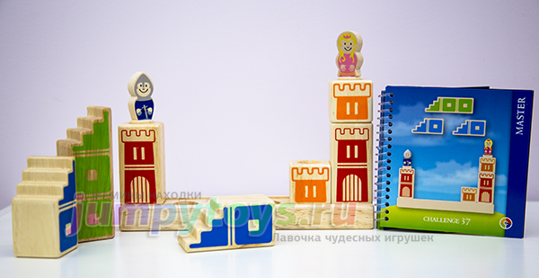 Что в комплекте? А только то, что вы увидели на заглавной фотографии: 8 кубиков (4 башни, 3 лестницы, 1 мост), подставка да рыцарь с принцессой. Все изготовлены из дерева, прослужат несомненно долгие годы. Плюс книжечка с 48-ю заданиями четырех уровней сложности.