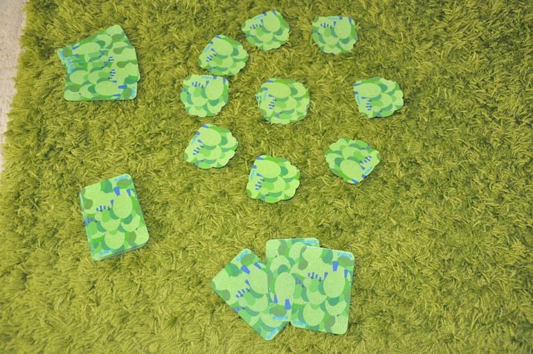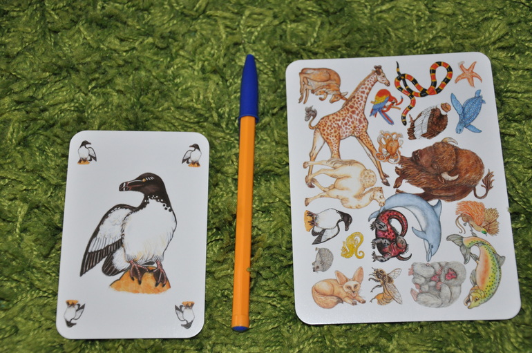Как играть: все игроки действуют одновременно. Прежде всего надо найти одинакового животного на своих картах и на центральной карте. Когда такое животное найдено, его надо назвать и перевернуть свою карту, на которой оно изображено картинкой вниз. Теперь эта карта в игре не участвует. Партия продолжается дальше таким же образом.