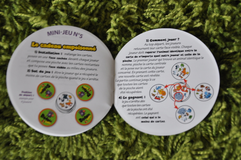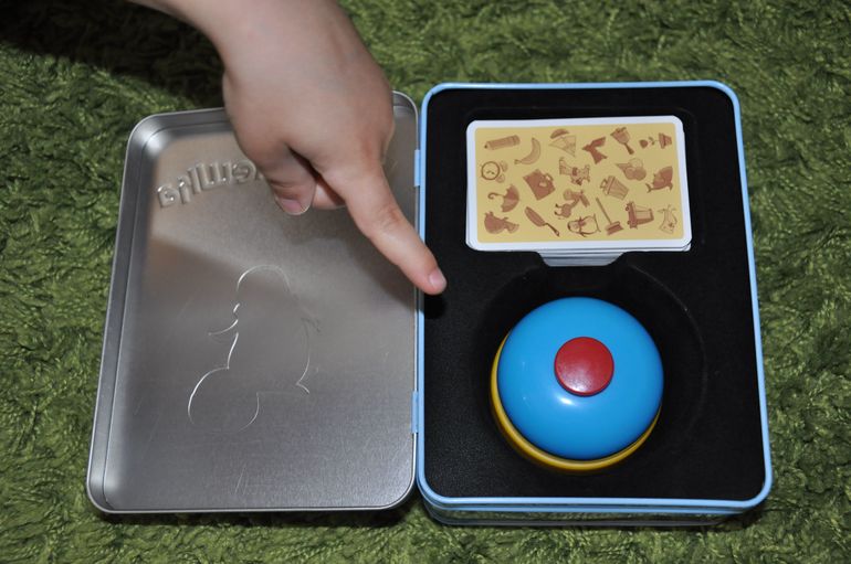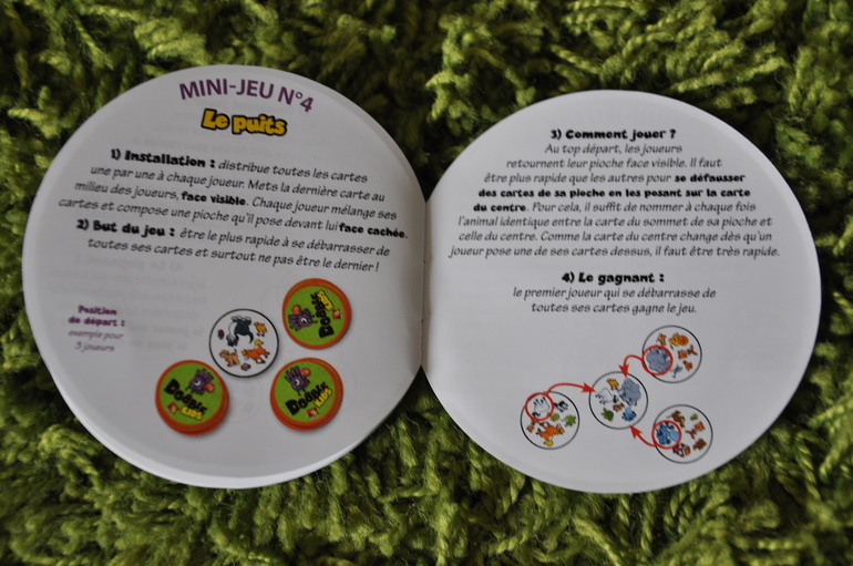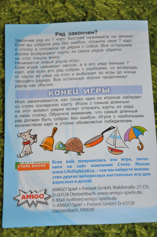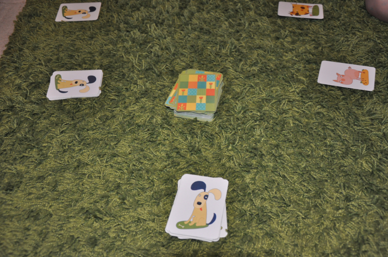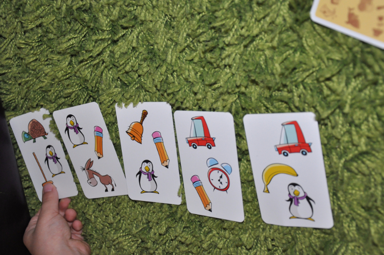 Как играть: прежде всего нужно стать первым сбросившим свою карту на карту в центре стола. Для того, чтобы это сделать, надо найти на своей карте такого же животного, что и на карте в центре стола и назвать его. Теперь нужно быть внимательными - карта в центре стола меняется, как только на нее кладется одна из карт игроков.