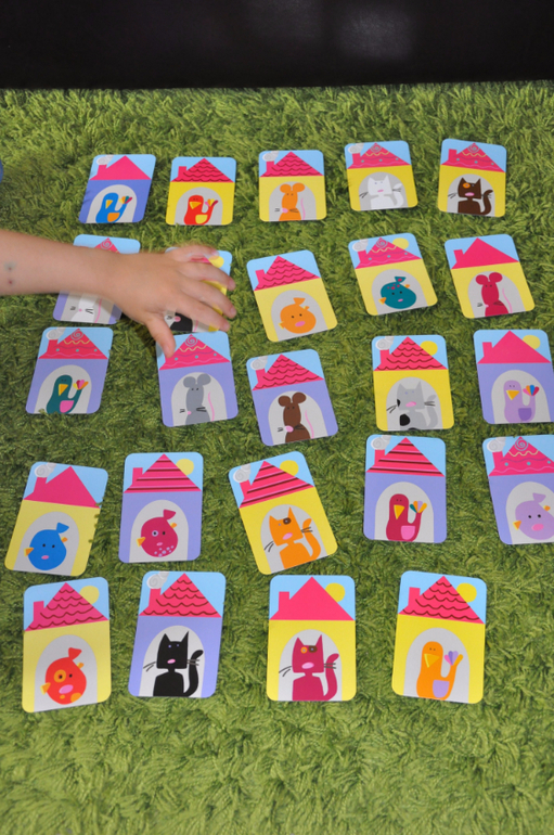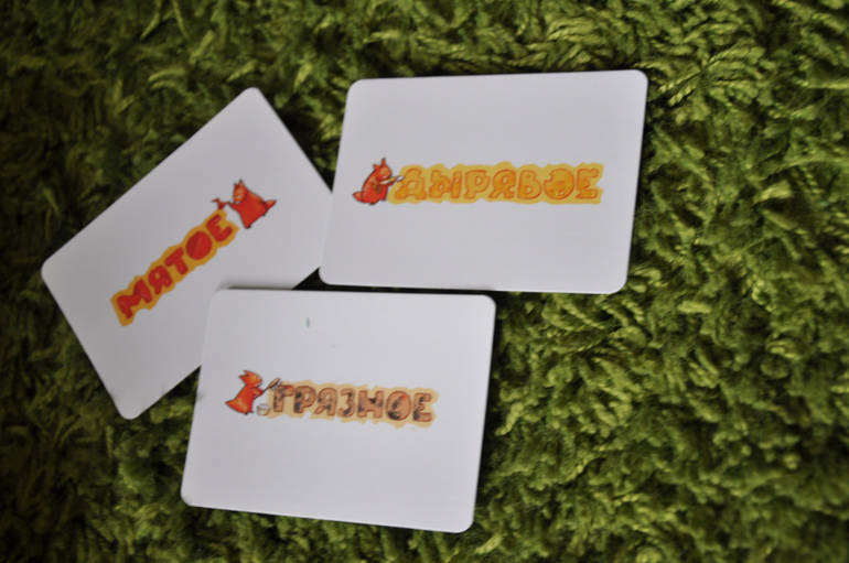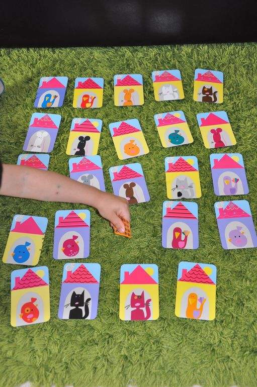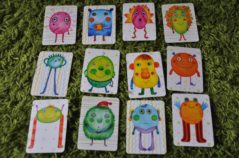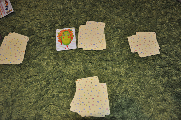 Мы играем в первый вариант - раздаем по 8 карт, а затем ищем на скорость "своих" на поочередно открываемых картинках-путаница: