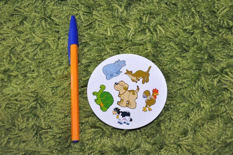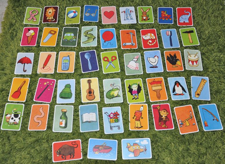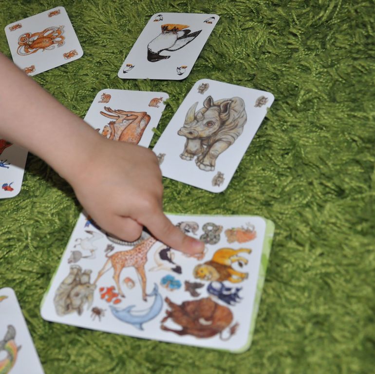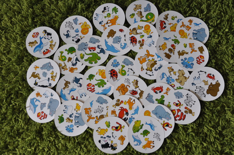 Как играть: сначала игроки одновременно переворачивают свои карты. Теперь цель каждого игрока - оказаться первым, кто найдет одинаковое животное на карте в центре стола и на карте одного из игроков (не своей). Как только он это сделает, это животное надо назвать и положить карту из центра колоды на карту того игрока, у которого было найдено совпадающее животное. Теперь вверху колоды оказалась новая карта. Игра продолжается до тех пор, пока в колоде в центре стола не закончатся карты.