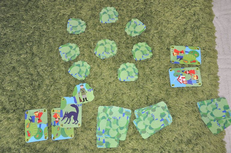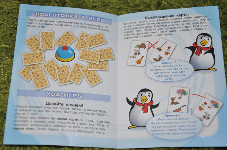 Перед началом игры: перемешиваем все карты и выкладываем картинками вверх 4 карты перед каждым ребенком и 6 карт перед каждым взрослым. Одну карту кладем картинкой вверх посередине стола, остальные карты складываем в коробку (количество карт, выкладываемых перед игроками может быть изменено в зависимости от возраста детей).