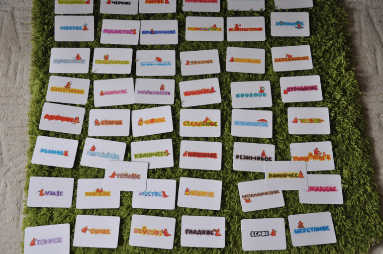 Мы вот недавно придумали доставать не по одной, а по несколько карточек - и придумывать предметы, имеющие такие свойства - Артуру это вполне под силу. Вот, например, из легкого: