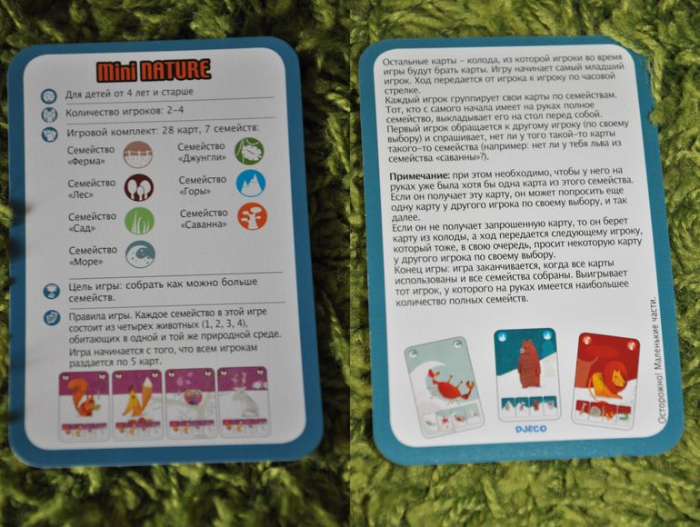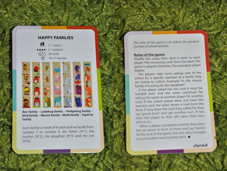 Начнем с "семеек" - это разновидность карточных (и не только) игр на собирание сетов карт, принадлежащих одному "семейству". Вариаций таких игр великое множество, только у Djeco по меньшей мере 5 игр такого типа. Мы сегодня расскажем об одной из них (еще 3 не открывали)).