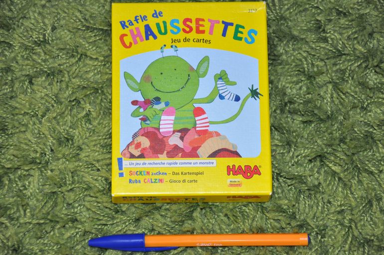 Как играть (это прямо перевод правил)): игрок с наибольшим количеством дырок на носках начинает игру (если к согласию в этом вопросе игроки не пришли,начинает самый младший игрок))). Он выкрикивает "Счастливый носок!", и раунд начинается. Теперь задача каждого игрока - собрать 5 пар одинаковых носков, при этом хватать карты можно только одной рукой и нельзя перехватывать карты у другого игрока.Тот игрок, который соберет 5 пар первым, хватает фигурку монстра из центра стола и раунд прекращается. Если в этот момент в руках других игроков были карты, они должны вернуть их на стол. Затем все игроки проверяют, правильно ли собраны пары носков у этого игрока. Если да, то он становится победителем раунда и получает карточку с носочным монстром, а если нет, то игрок ничего не получает, а остальные игроки подсчитывают пары собранных носков у себя - тот, у кого их больше, берет себе карту с носочным монстром.