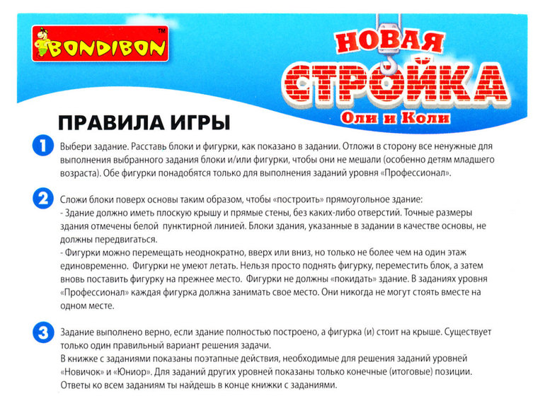 Тайны игрового мира. ОБЗОРЫ, ФОТО, ОПИСАНИЯ, идеи, рекомендацииСегодня расскажем об еще одной логической игре Smartgames (Bondibon) - "Новая стройка Оли и Коли". Игра интереснейшая! Этакий 3D-тетрис, есть над чем подумать и детям, и даже взрослым. Возрастные рекомендации соответствующие: от 5 до 99 лет ))