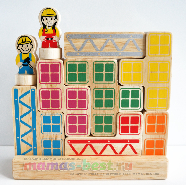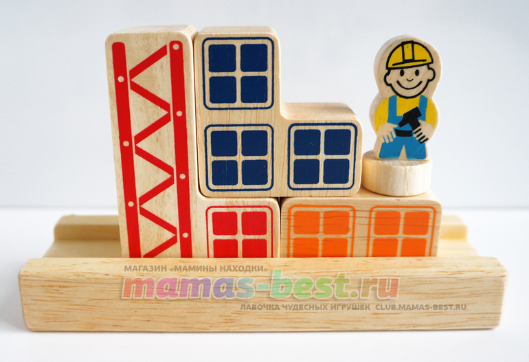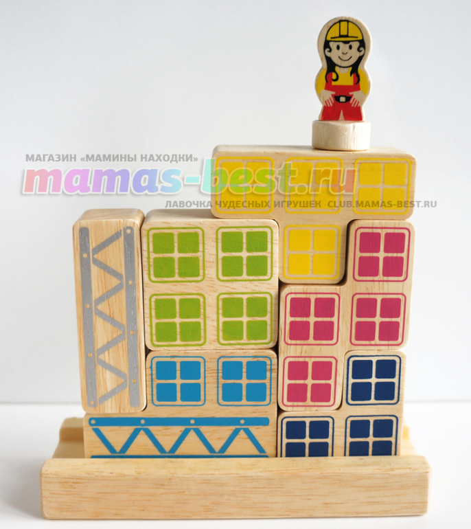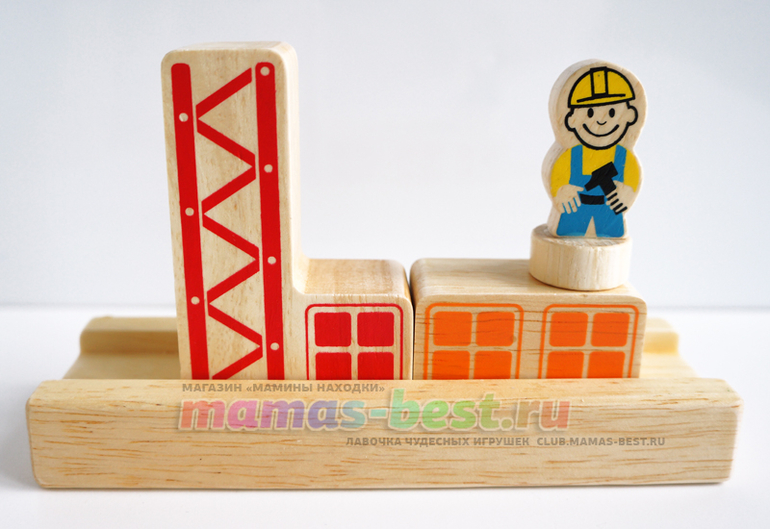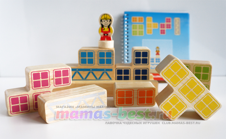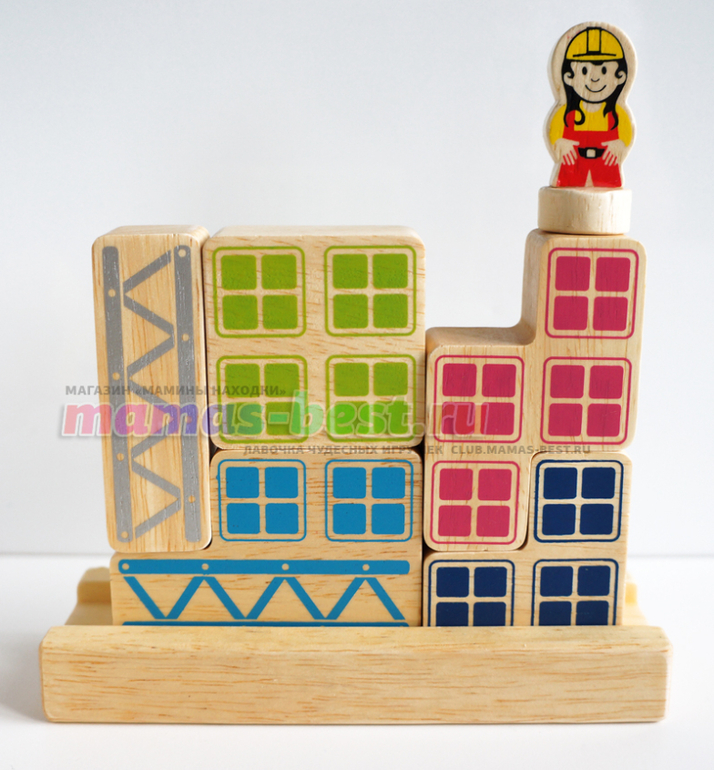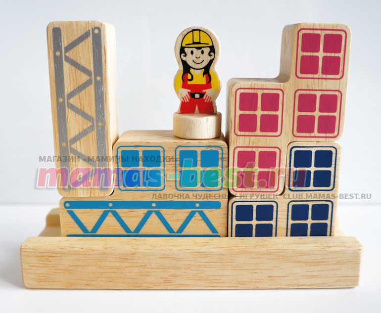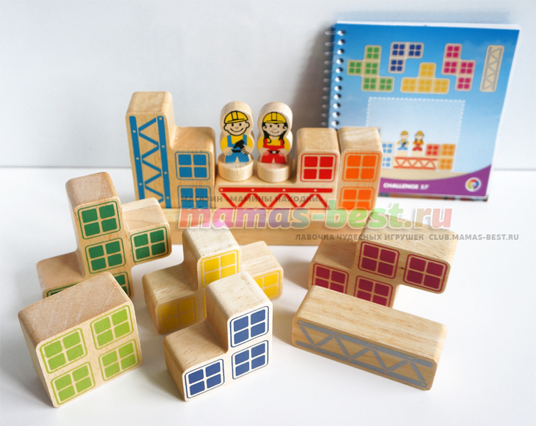 В наборе 12 деревянных деталей (подставка, 9 кубиков разной формы, 2 фигурки строителей), а также книжка с заданиями. Качество деталей отличное! Все гладенькое, уголочки скруглены: