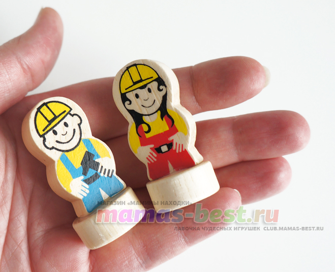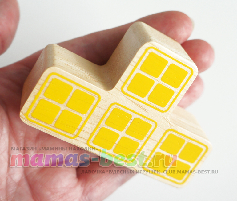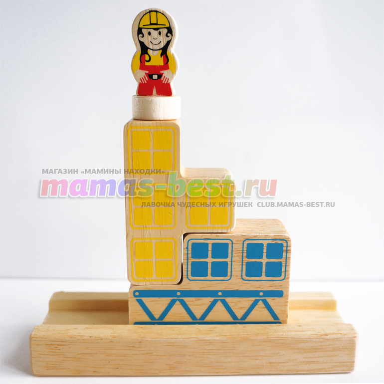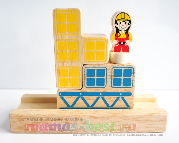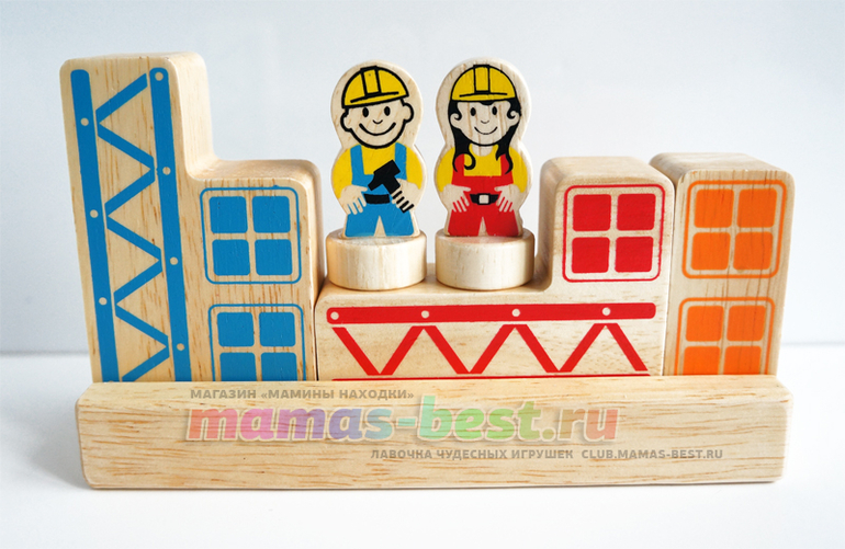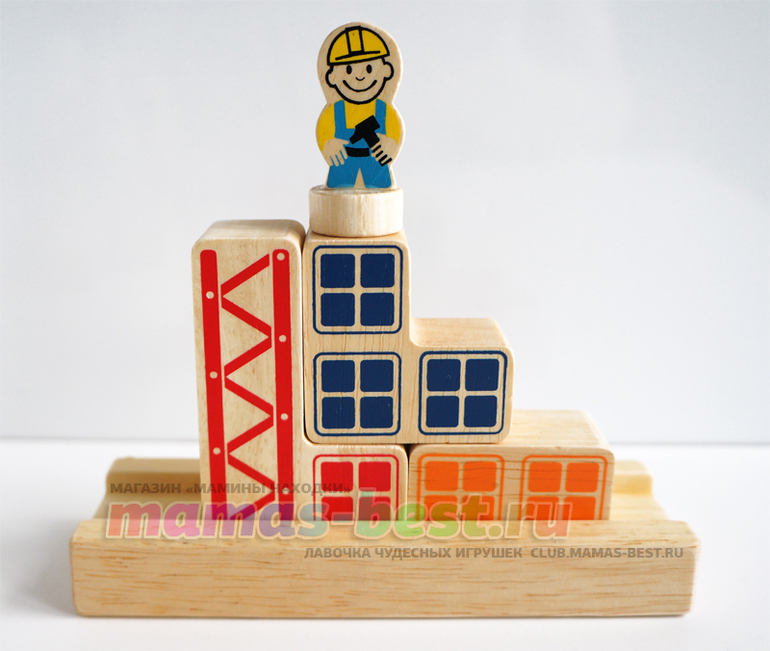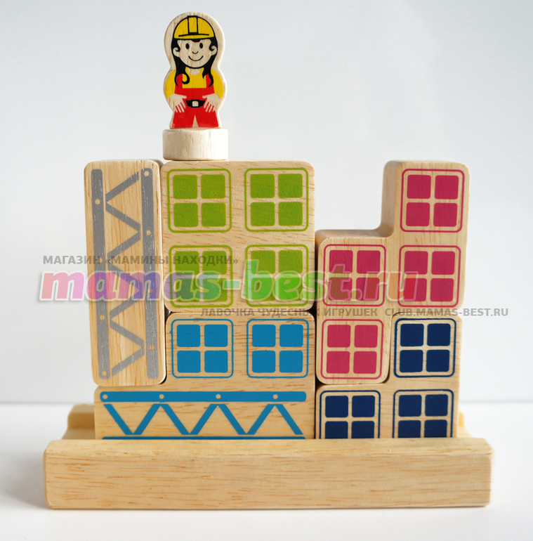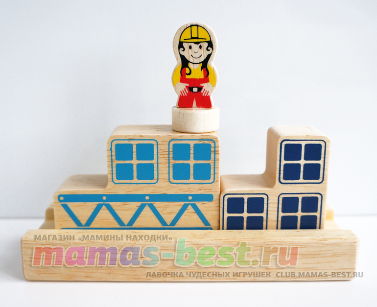 В наборе 12 деревянных деталей (подставка, 9 кубиков разной формы, 2 фигурки строителей), а также книжка с заданиями. Качество деталей отличное! Все гладенькое, уголочки скруглены: