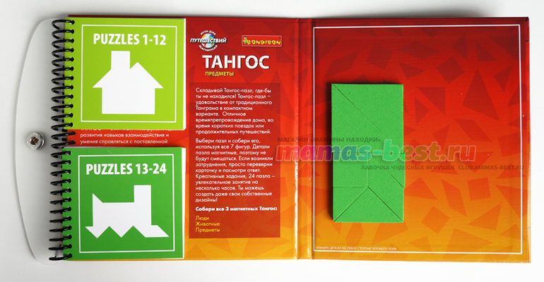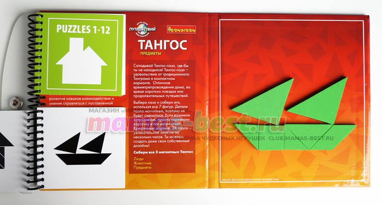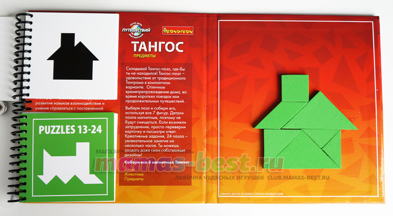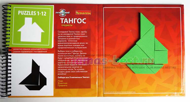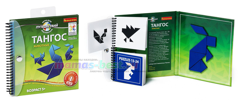 Игра "Тангос" изготовлена в виде маленькой плотной книжечки, которая содержит множество заданий с изображениями различных животных. Фигуры можно складывать из магнитных деталей, которые крепко держатся внутри книжечки-футляра. Размер игры позволит без труда взять её с собой в любое путешествие. Внешне простая игра окажется увлекательным спутником в любых путешествиях!