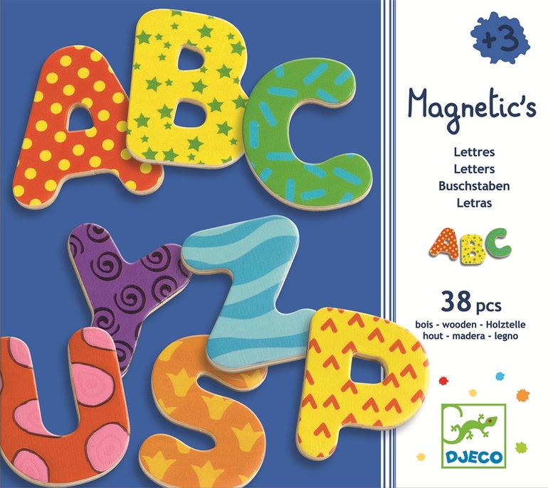 В комплекте 38 цветных деревянных латинских букв на магнитной основе с разными узорами. В качестве основы для игры можно использовать детскую магнитную доску или любую другую металлическую поверхность, например, холодильник. С помощью этого набора малыш познакомится с буквами, научится составлять слова, запомнит алфавит и сможет выполнять другие упражнения.