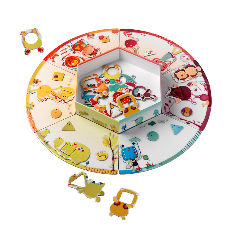 Также в состав игры входят 18 животных, сделанных также из плотного картона, с прорезью на месте лица. Прорезь либо круглая, либо квадратная, либо треугольная. Задача - найти для каждого животного его домик (карточку соответствующего ему цвета) и место его (или его мордочку) в этом домике ("надеть" зверя на один из трех, подходящих ему, выступающих элементов карточки - домика).