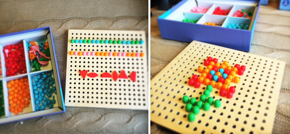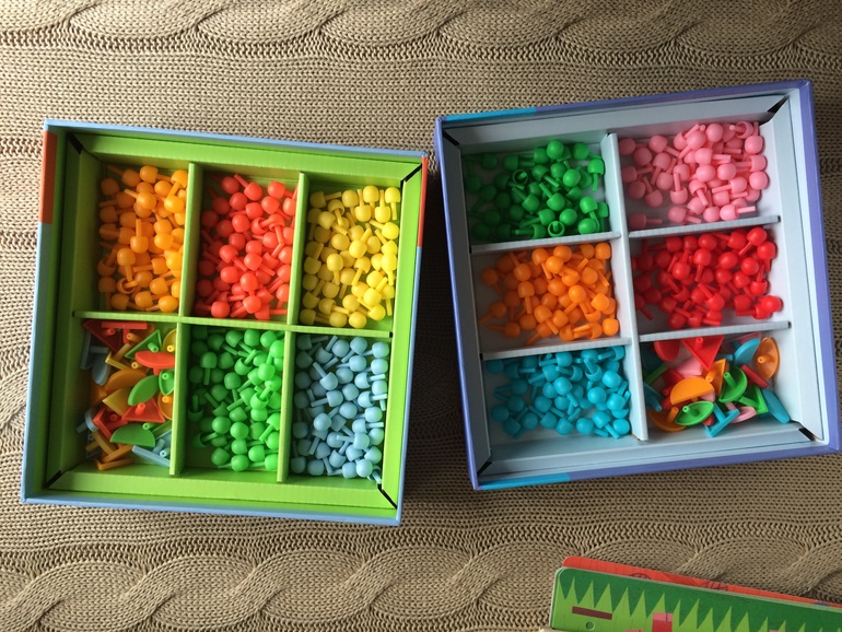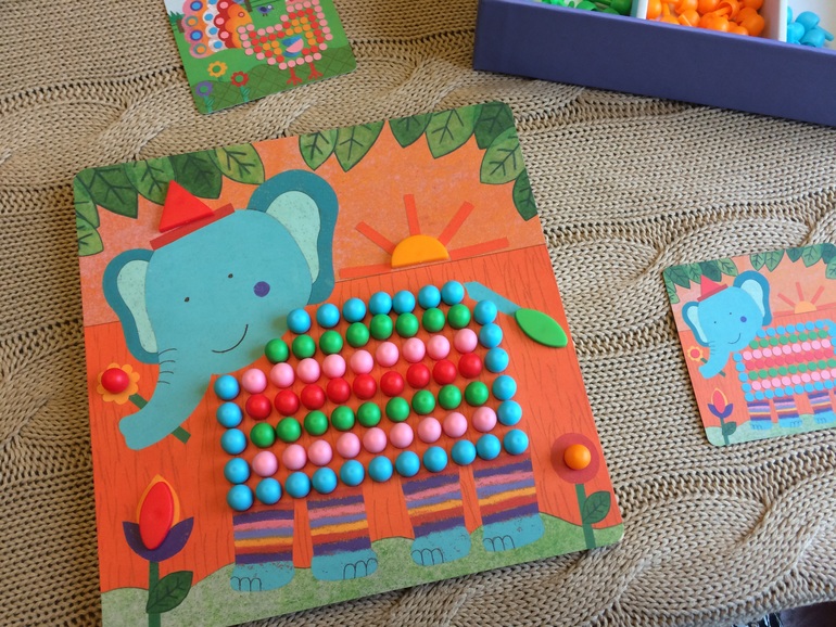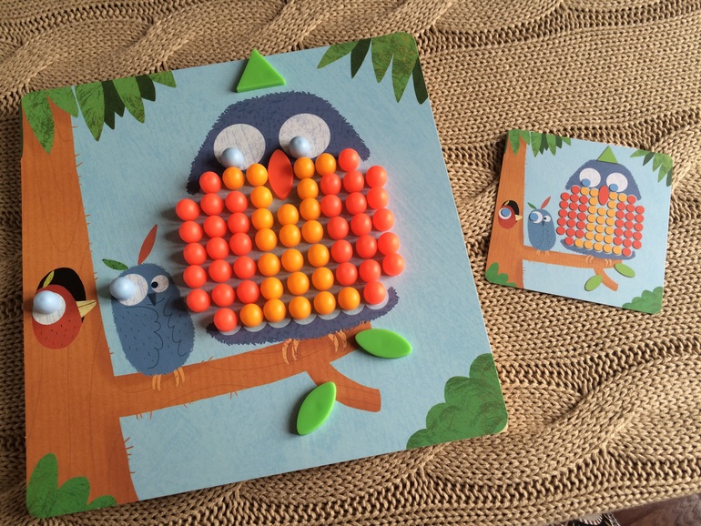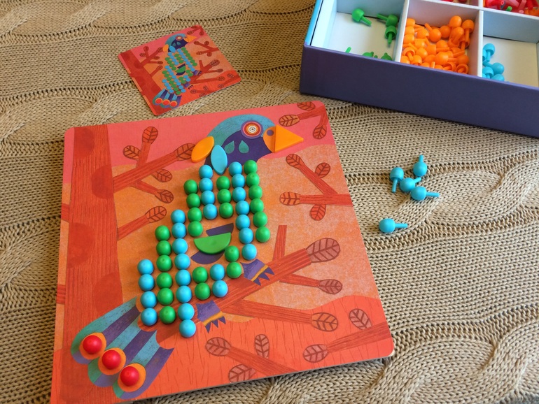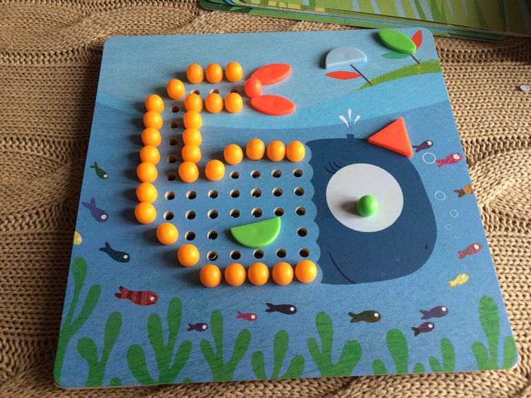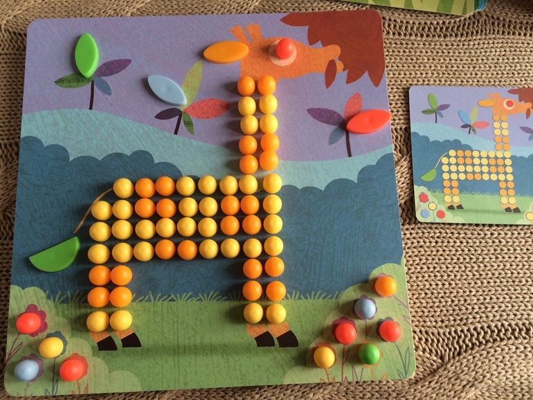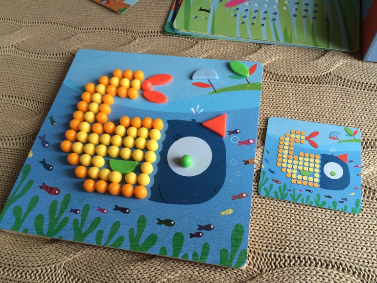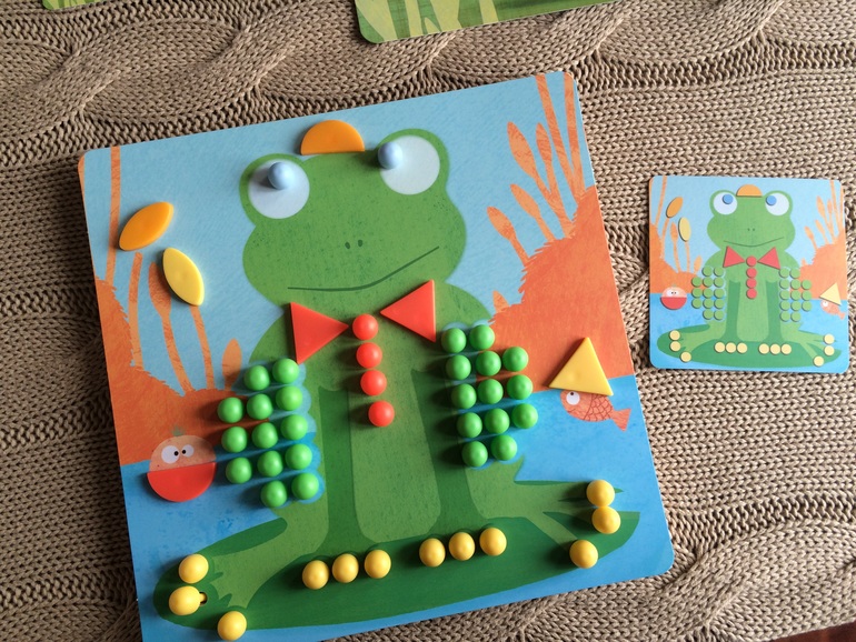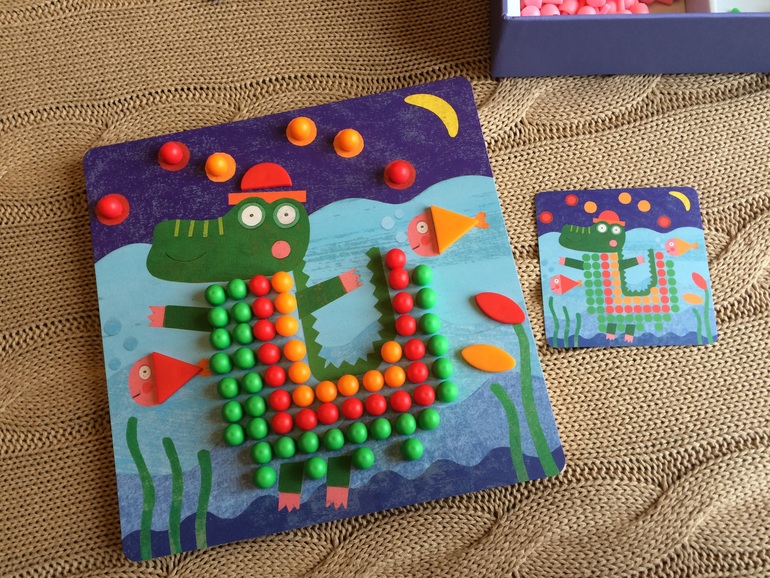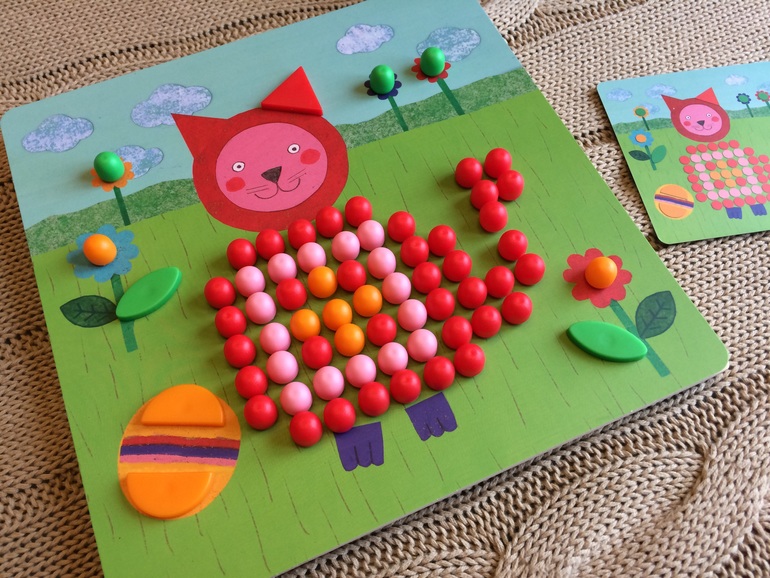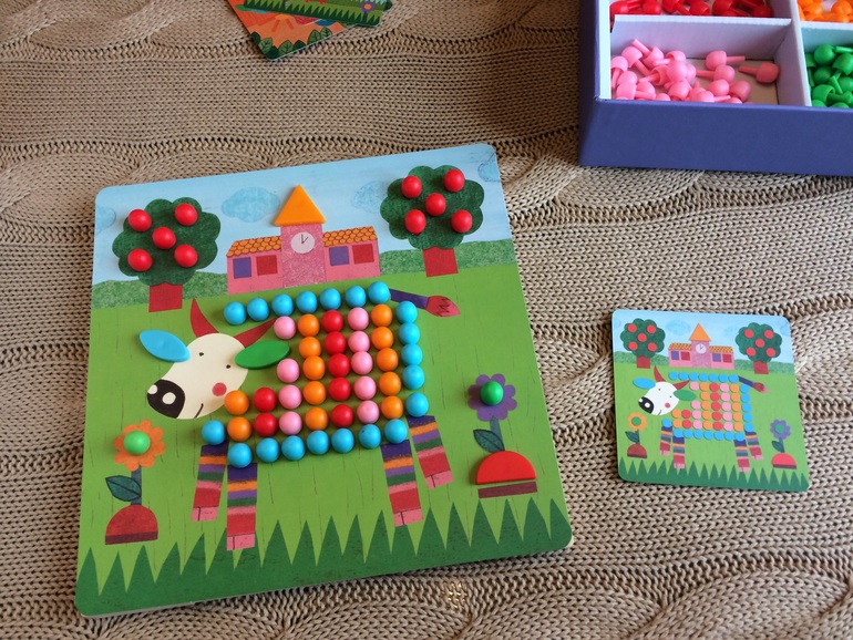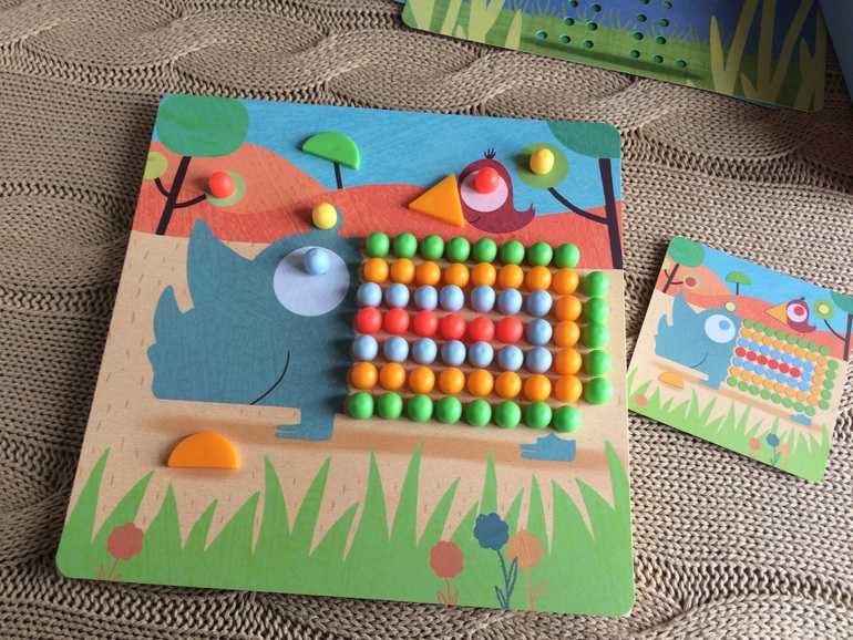 Для начала - общие впечатления. Мы, как и многие на ББ, начинали с мозаики Plan Toys. Лет с 1,5, под строгим маминым присмотром. Детальки-то небольшие! Для развития моторики - милое дело! Вставлять "гвоздики" в дырочки нам нравилось, но карточек было маловато, конечно. Знаю, что многие сами рисуют, у меня руки так и не дошли. Еще часто использовали ее для сортировки - любимое занятие малышни ))