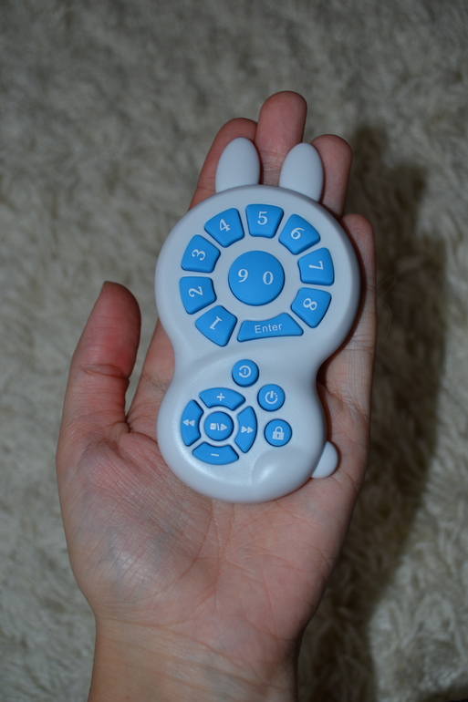 Пульт управления сделан в форме зайки) Очень милый и приятный и ощупь. Вид зайки сзади. Хвостик крутится регулируя звук и вкл. и выкл. зайку .