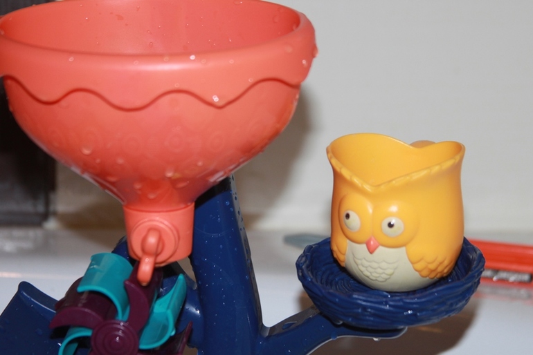 Мельничка крупная, наверху воронка с краником (регулировать поток воды), в воронку наливаем воду, вода течет-бежит, попадает на всевозможные вертушки - все крутится, вертится, детям весело :)