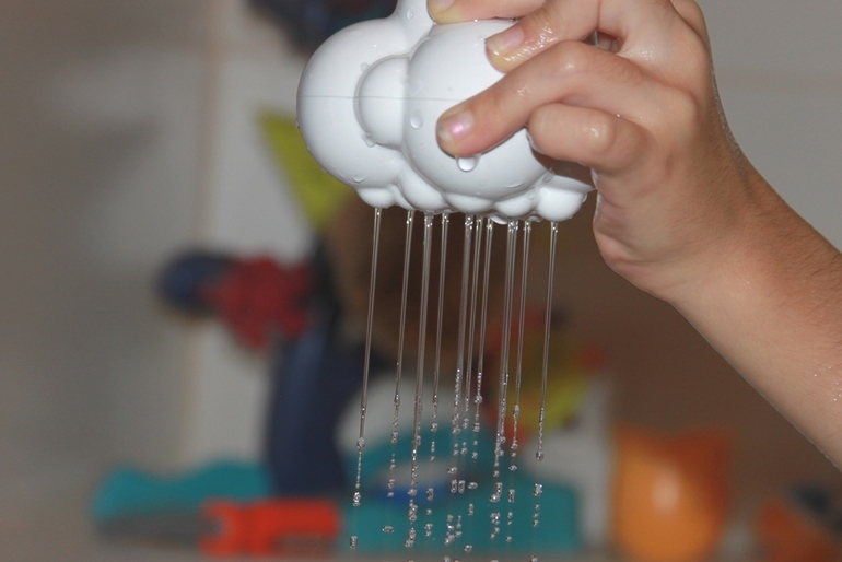Принцип тучки простой: наверху есть дырочка, в нее набираем воду, поднимаем над водой - в нижние мелкие дырочки вода вливается настоящим дождиком, затыкаем пальцев верхнюю дырочку - дождь перестал, пальчик убираем - снова идет - так можно делать часто-часто, то прекращая, то запуская дождик, быстрые капельки, редкие, ливень, в конце-концов)))
