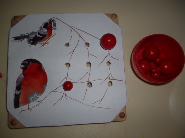 вообще вот эта идея возникла, когда я увидела коробку из-под конфет с двумя снегирями, вырезала их за минуту, наклеила и нарисовала за 2 секунды схематично веточки, а дырки под детальки проделать очень легко: я просто ручкой без стержня протыкиваю бумагу, на самой деревянной подставке и получаются сразу дырочки, ничего не измеряю, не высчитываю. ТО есть делов на 3 минуты, зато потом сколько радости ребенку.