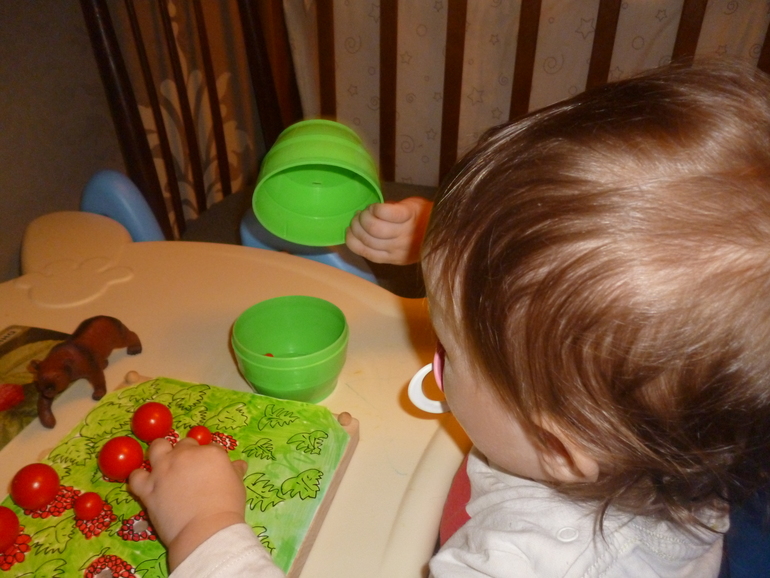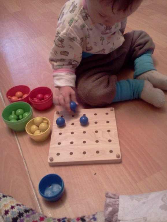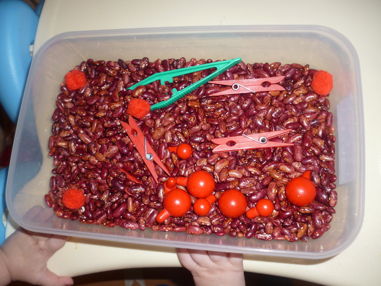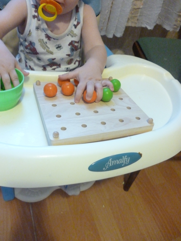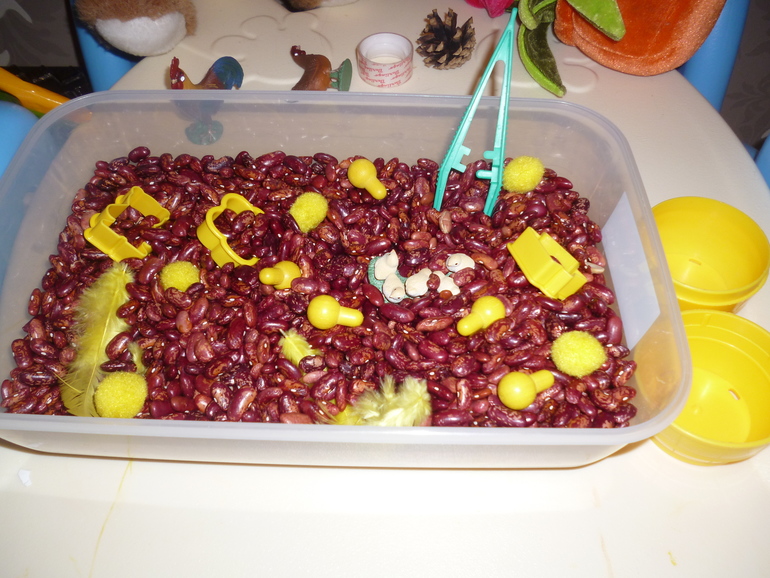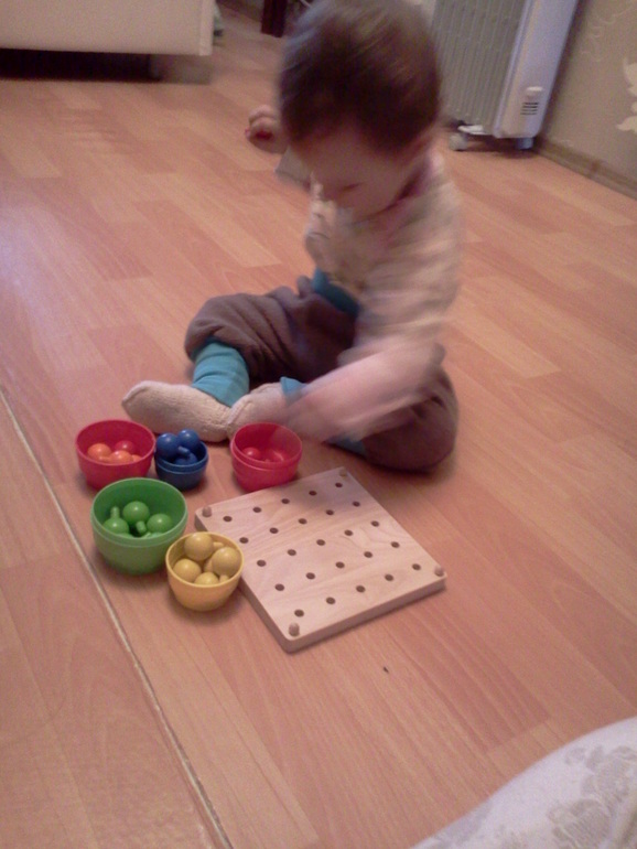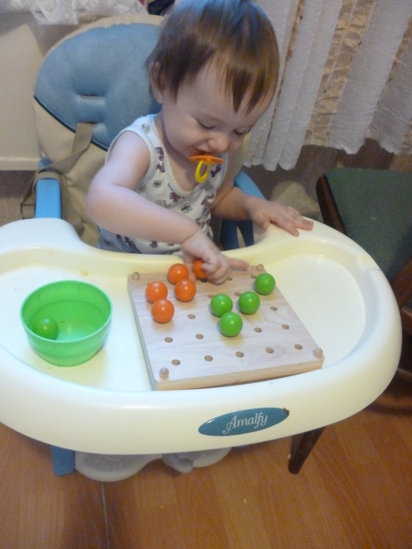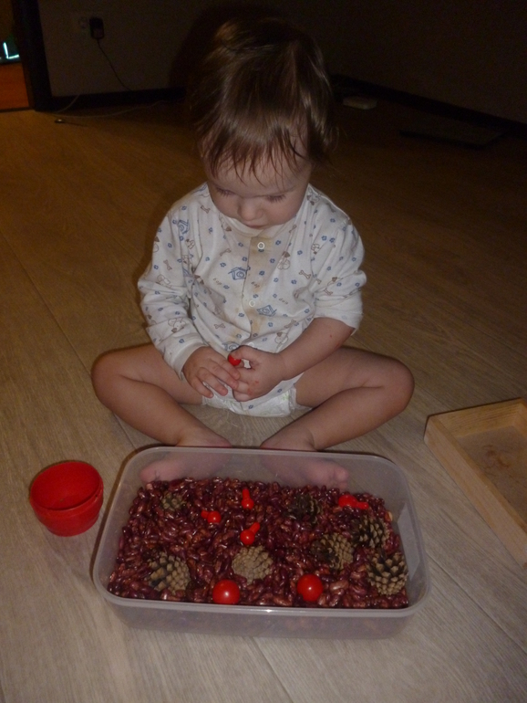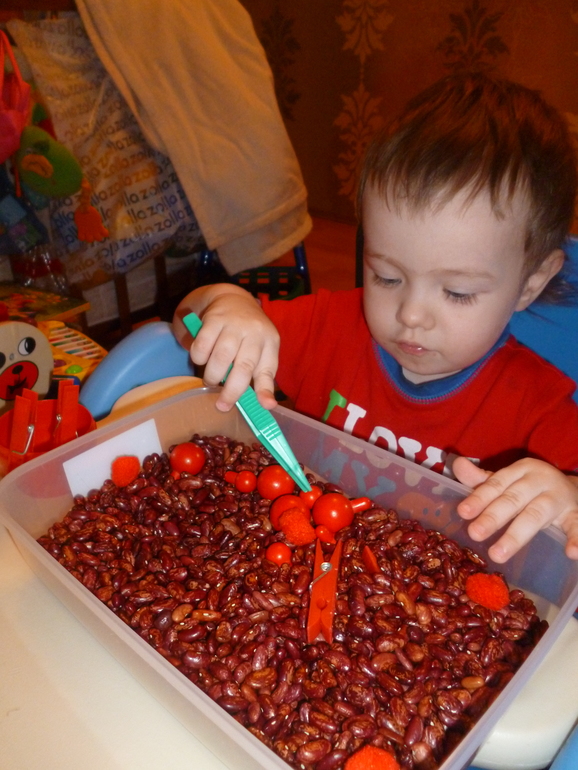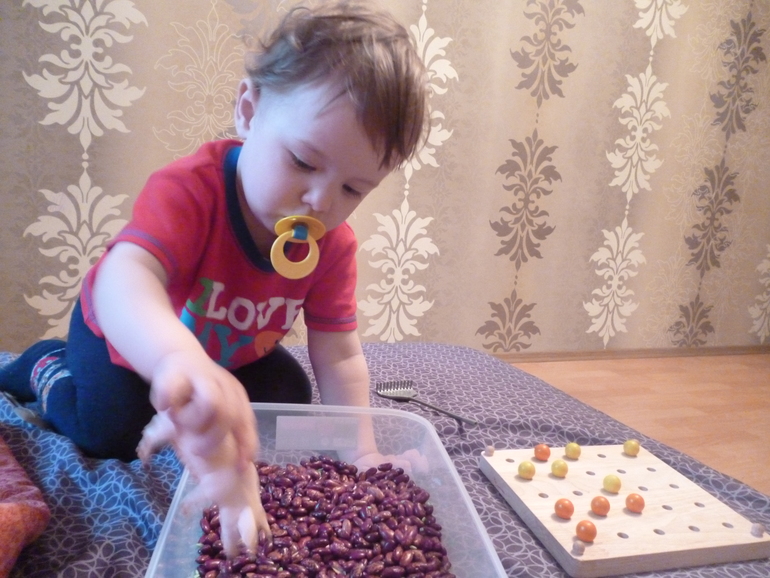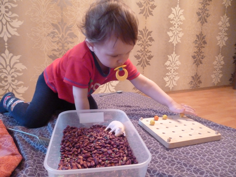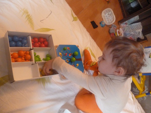 Цветные дни ваши очень понравились, так ярко детальки смотрятся в фасоли, Вы правы про хорошие цвета ) А как усердно малышок толкает детальки в дырочки, умничка!