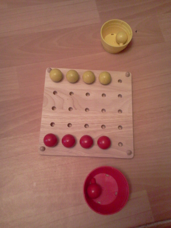 Очень удачно у меня подобрались и баночки соответствующих цветов.Конечно, для первого знакомства с цветами, такого количества слишком много, поэтому я оставила два цвета, и мы потихоньку стали изучать цвета, выкладывая из деталек последовательности или просто полоски из одного цвета.
