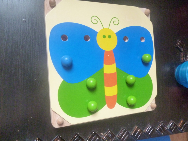 Кстати, коробка в которой находится игрушка, нисколько не утратила своего внешнего вида, ее хоть сейчас дари!!!!!! Качество высочайшее! Всего в наборе деревянное поле, очень качественно сделанное, 3 трафарета: для начинающих цветок, для уже умеющих - бабочка и для асов - дерево с почти всеми цветами. И, конечно, сами детальки-шишечки двух размеров:маленькие и большие 5 цветов каждый(по 5 штук): красного, синего, зеленого, желтого, оранжевого.
